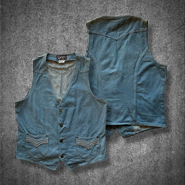 近年『OLD GAP』として過去のアイテムの人気が高まっている『GAP』のデニムベストです。 こちらのアイテムにはギャップの中でもよく見かける90年代頃のタグとは異なるフォントとタグのフォルムに加え、ブランドネームが小文字だった時期のタグが首元に取り付けられています。 古着がお好きな方でも見かける機会はあまり多くないディテールではないでしょうか。 爽やかで清涼感のあるライトインディゴのボディにウエスタンウェアらしい意匠が落とし込まれたデザインはレイヤードすることでコーディネートにさまざまなエッセンスを付与してくれそうです。 装飾性の高い両裾のポケットに向かって可動性を高めてくれるダーツが入っていたり、機能に関しても綿密なこだわりが感じられます。 ボタンは裏面の刻印を見れば分かる通り、SCOVILL社製。 原稿のアイテムと異なるディレクションのデザインだけでなく、こういった目に見えない部分にも古着好きを喜ばせる要素が散りばめられているのもこちらのアイテムの魅力かと思います。 【サイズ】XL 【カラー】ライトインディゴ 【生産国】香港 【素材】コットン100% 【状態】目立ったダメージや汚れなし 【実寸】 着丈 約59cm(後身頃) 身幅 約55cm 肩幅 約36cm ※梱包時に生じる折り皺などはご了承ください。 ※サイズには多少の誤差が生じる場合がございます。あらかじめご理解の上購入をご検討ください。 ※古着の性質上、記載した箇所以外にもダメージや汚れがある可能性がございます。あらかじめご理解の上購入をご検討ください。