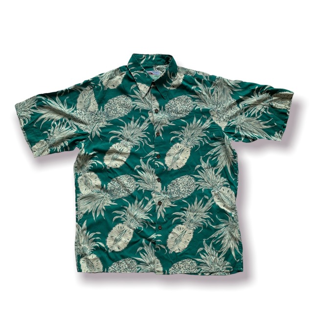 先日よりユニクロとのコラボも始まった名門アロハシャツメーカーである『Reyn Spooner』の80sアロハシャツです。 爽やかなエメラルドグリーンのボディ一面に白いパイナップルがあしらわれており、なんともアロハシャツらしい一着になります。 ディテールとしてはレーヨン100%のボディや首元のダイヤモンドヘッドタグなど、古着好きの感性をくすぐるポイントが多いです。 状態も良好なのでこれから先も長く着ていけるアロハシャツかと思います。 この機会に是非購入をご検討ください。 【サイズ】S 【カラー】エメラルドグリーン、ホワイト 【生産国】米国(ハワイ) 【素材】レーヨン100% 【状態】目立ったダメージ、汚れなし 【実寸】 着丈 約72cm(後身頃) 袖丈 約29cm 身幅 約59cm 肩幅 約45cm ※梱包時に生じる折り皺などはご了承ください。 ※サイズには多少の誤差が生じる場合がございます。あらかじめご理解の上購入をご検討ください。 ※古着の性質上、記載した箇所以外にもダメージや汚れがある可能性がございます。あらかじめご理解の上購入をご検討ください。