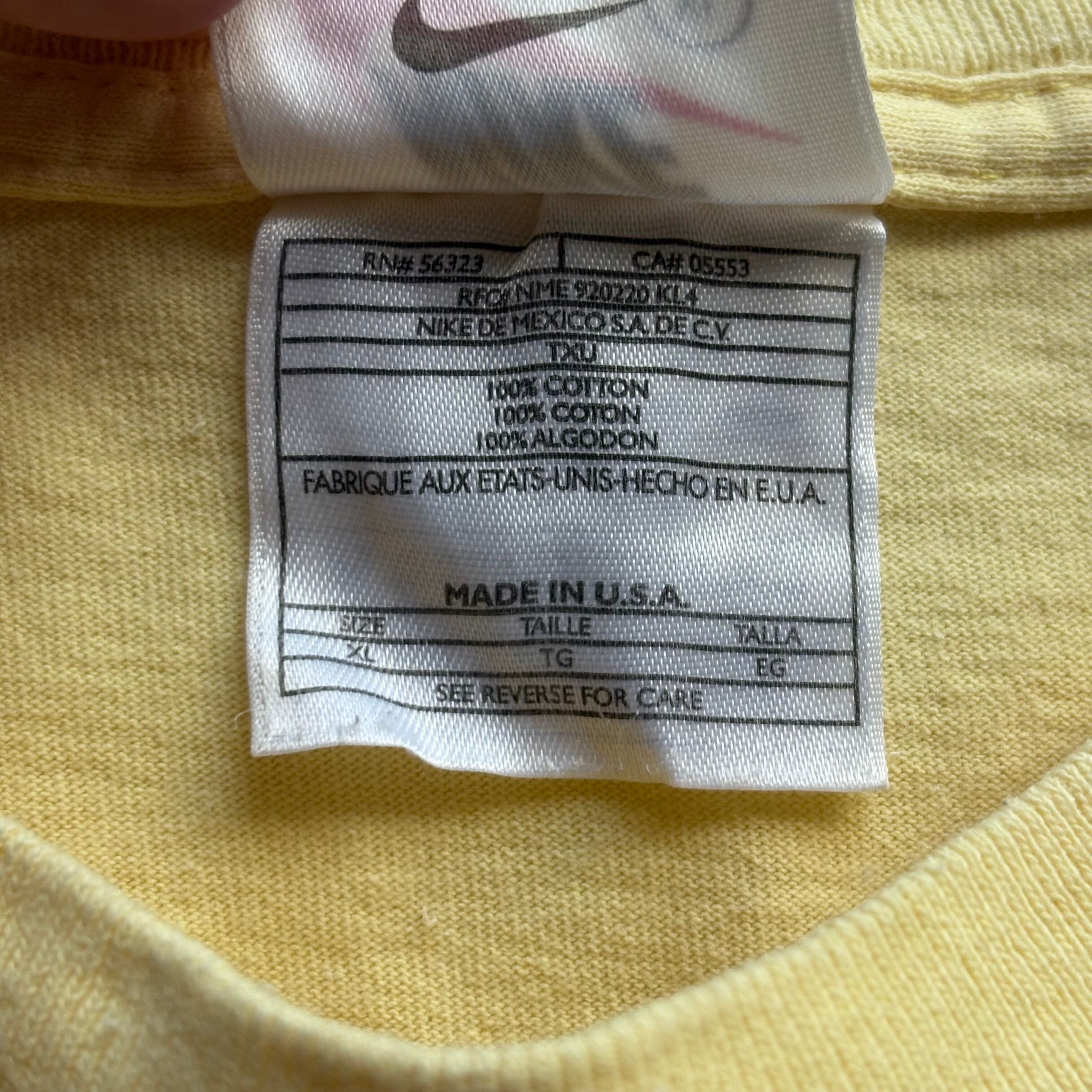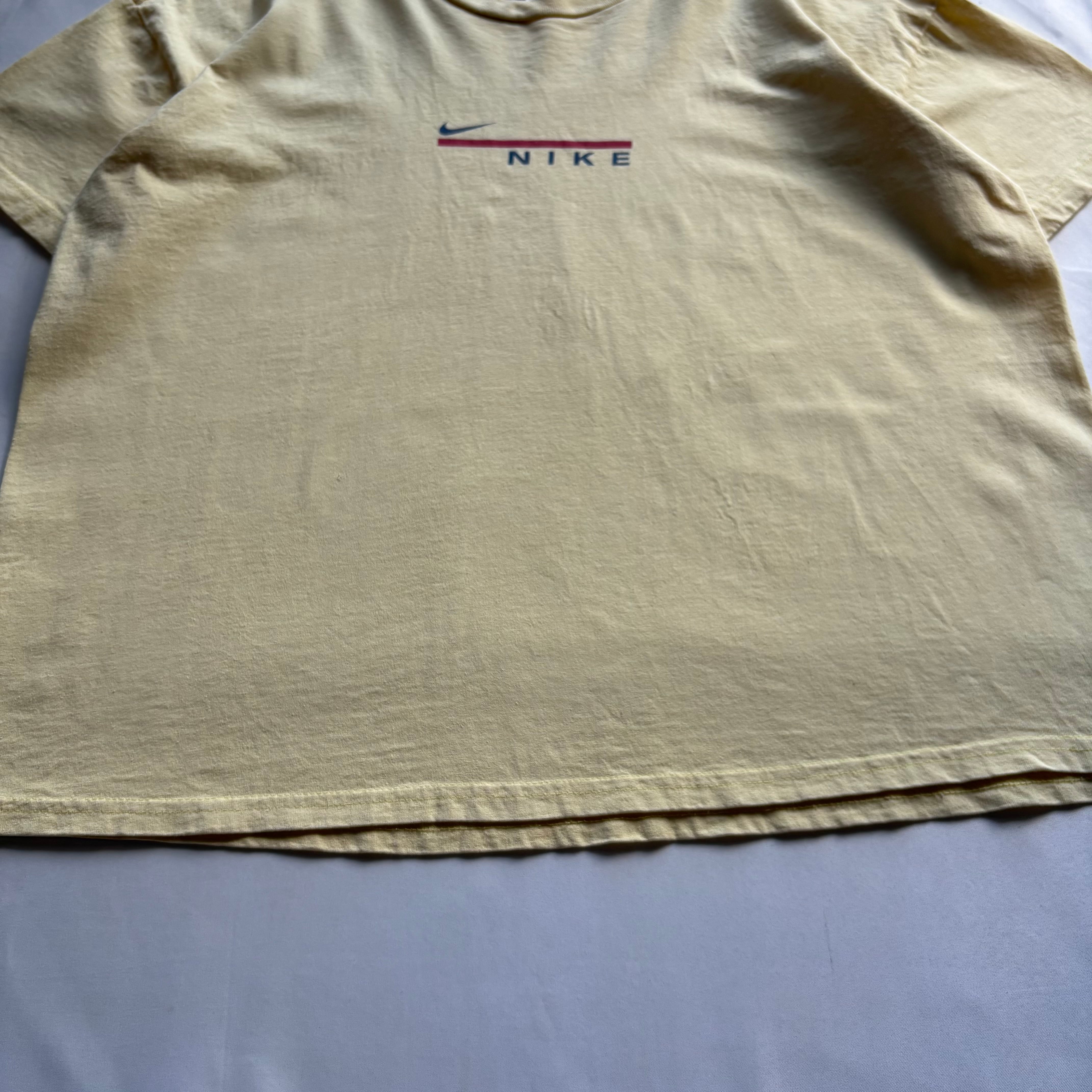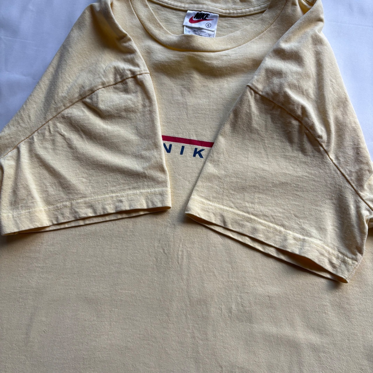 淡いイエローのカラーリングのボディにシンプルなロゴプリントが施されたこの年代のナイキらしいデザインの一枚になります。