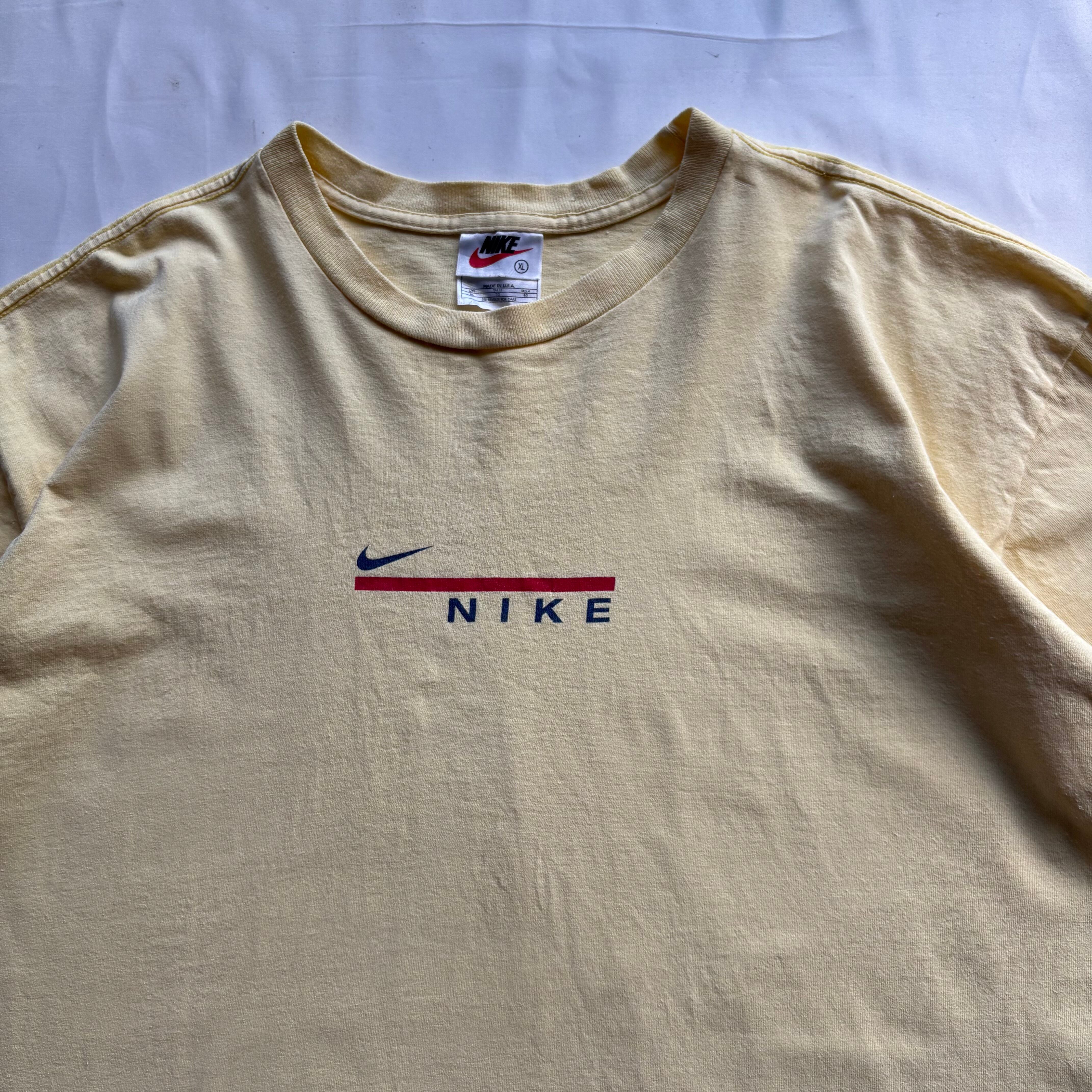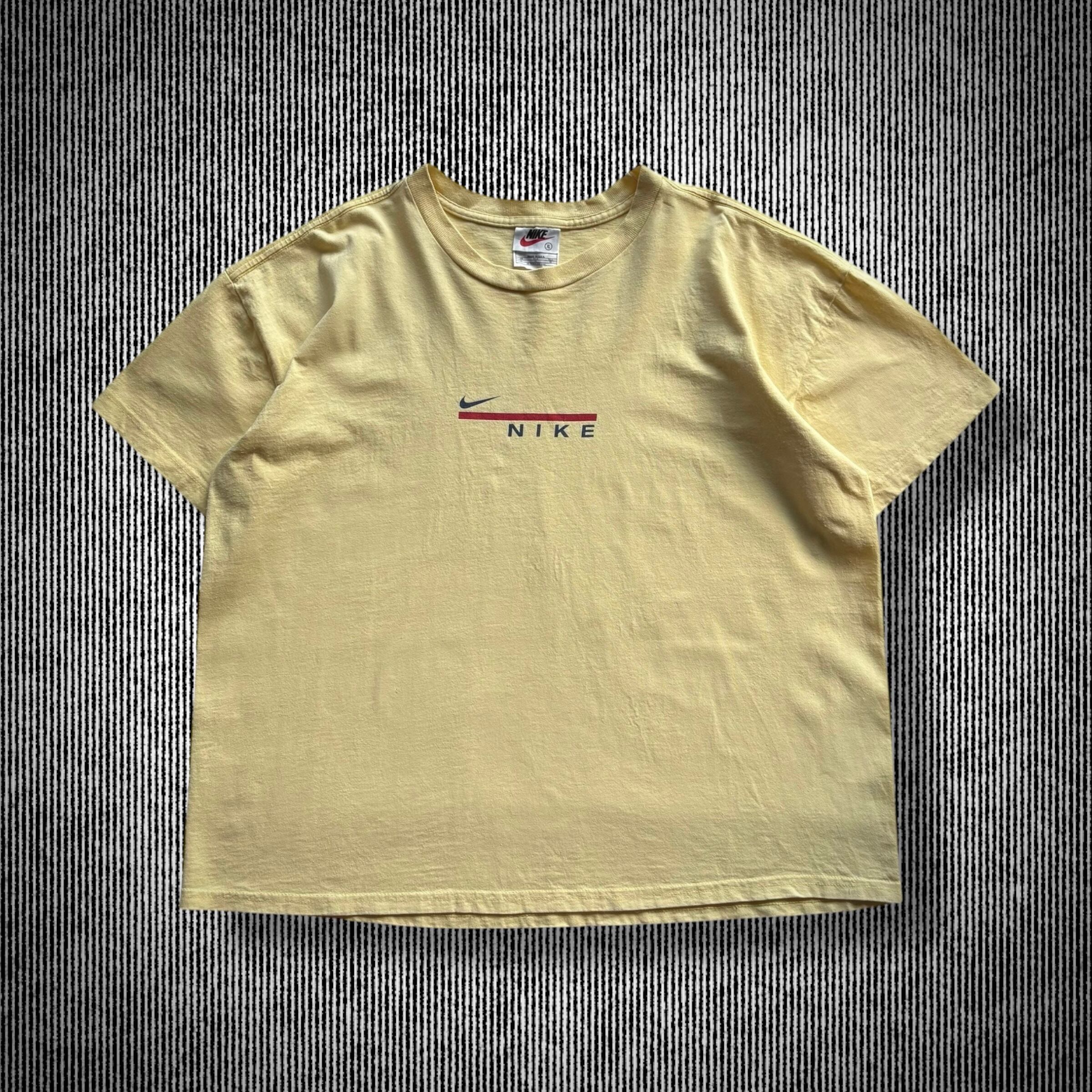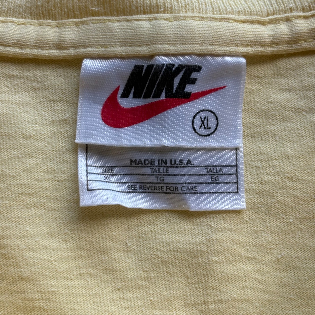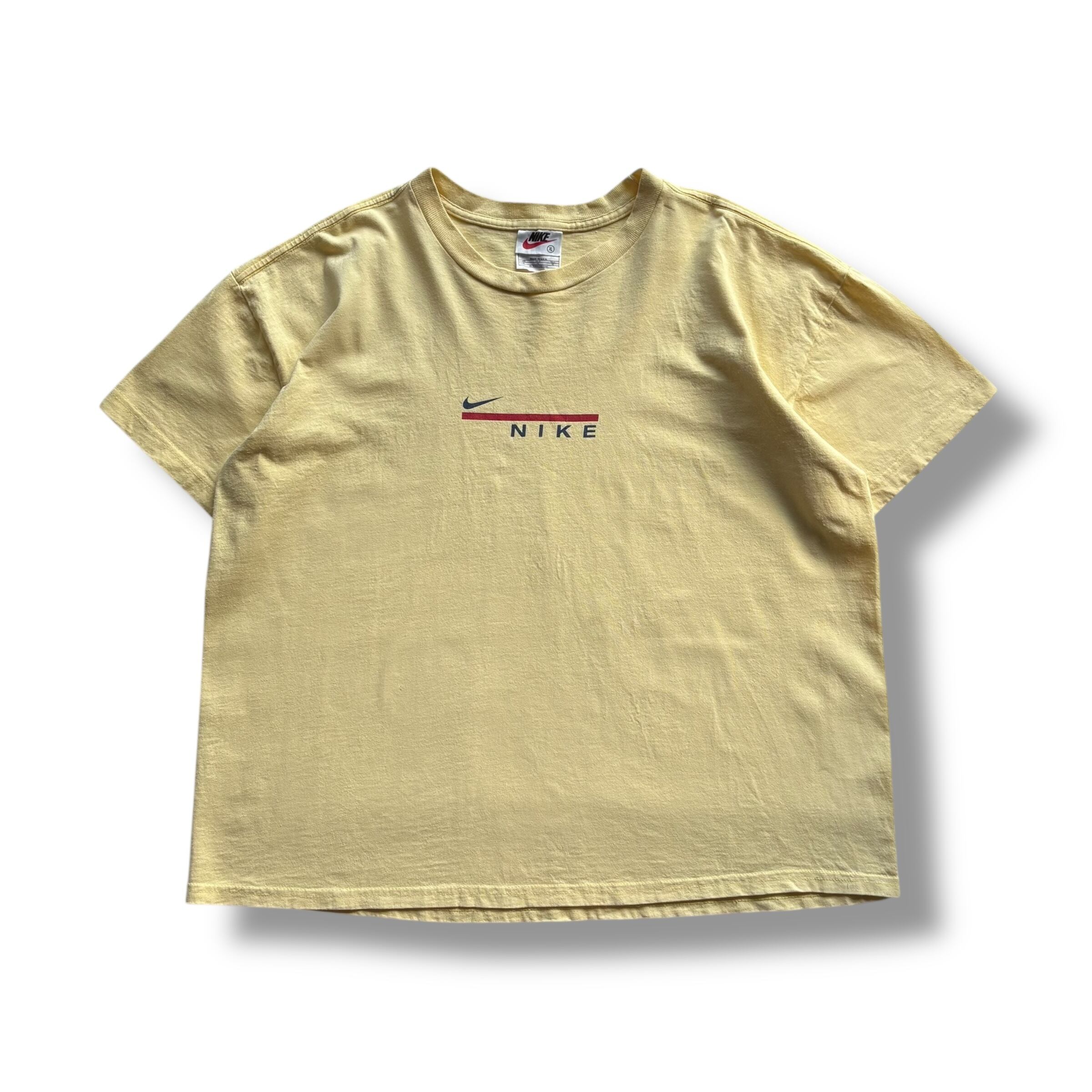 淡いイエローのカラーリングのボディにシンプルなロゴプリントが施されたこの年代のナイキらしいデザインの一枚になります。
