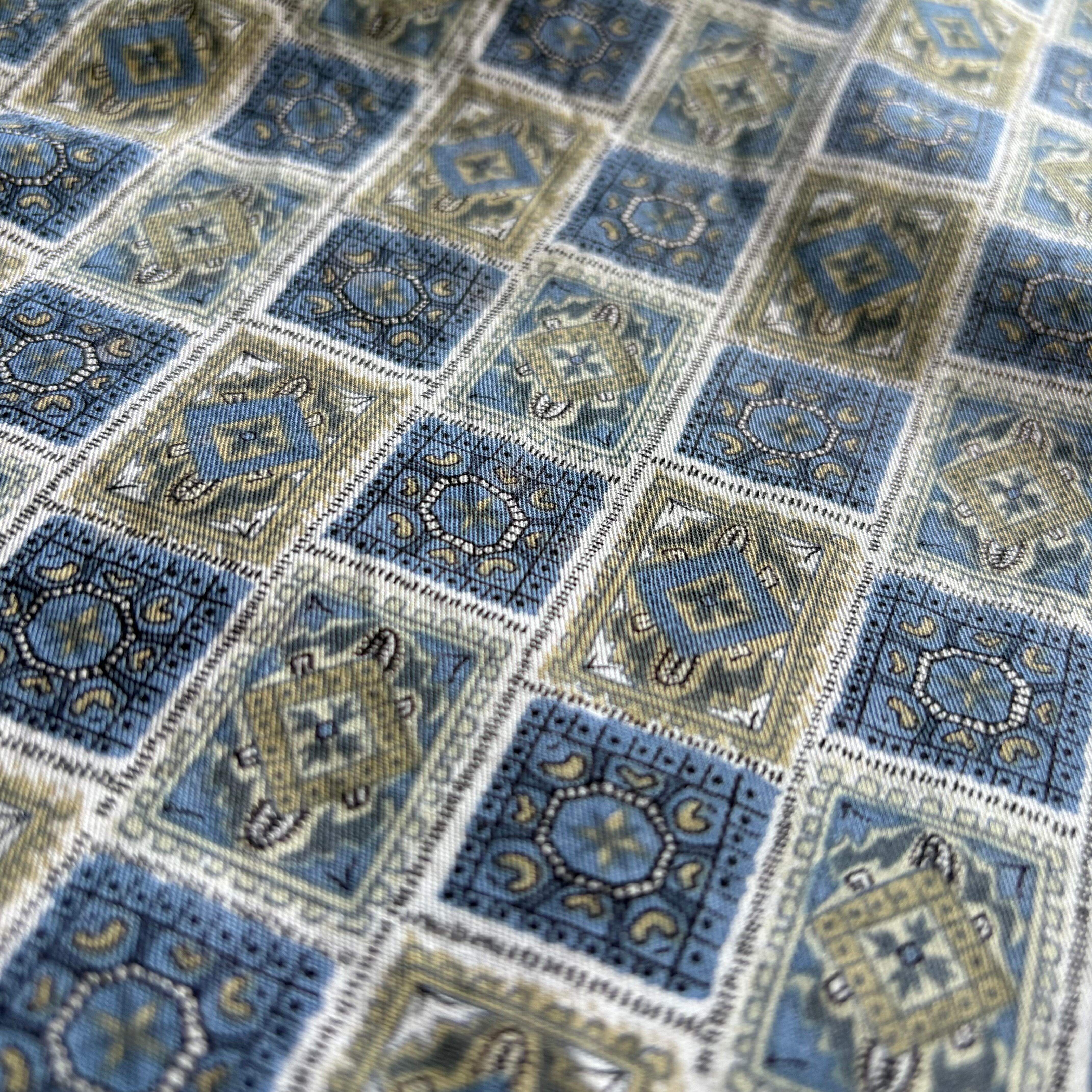 由緒正しい陶磁器のような精緻な模様が全面に落とし込まれた静謐な雰囲気が漂う爽やかな色使いのこちらの一枚。