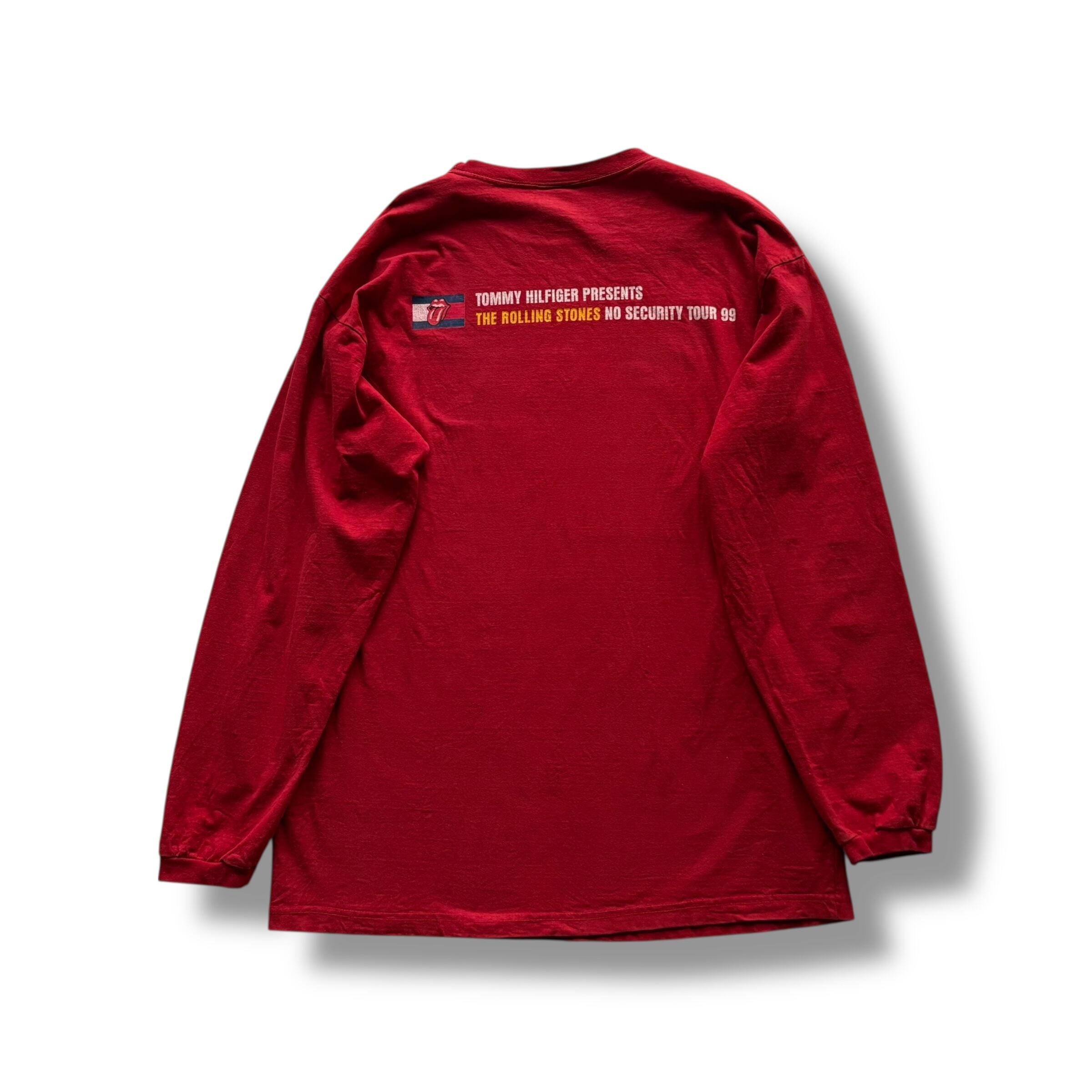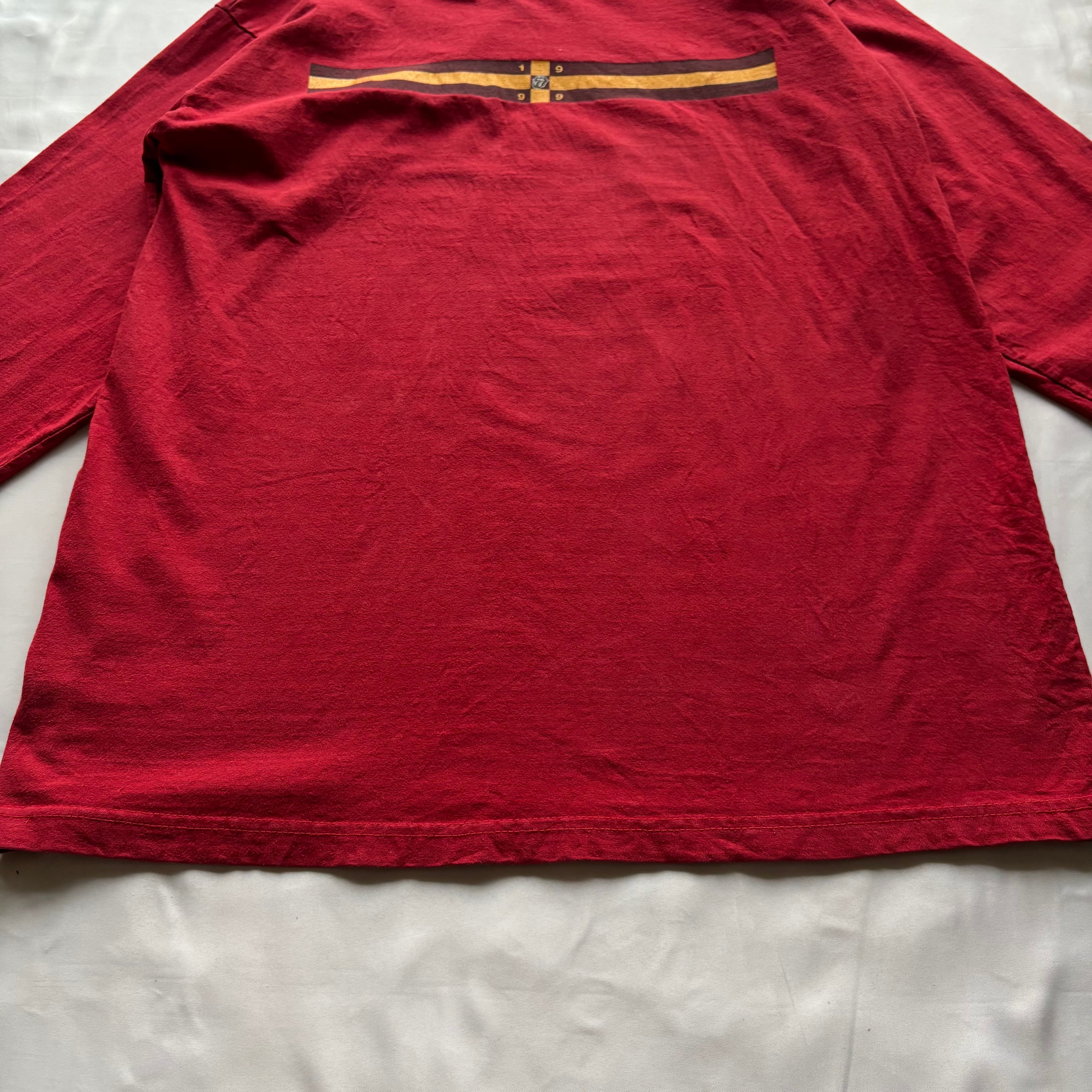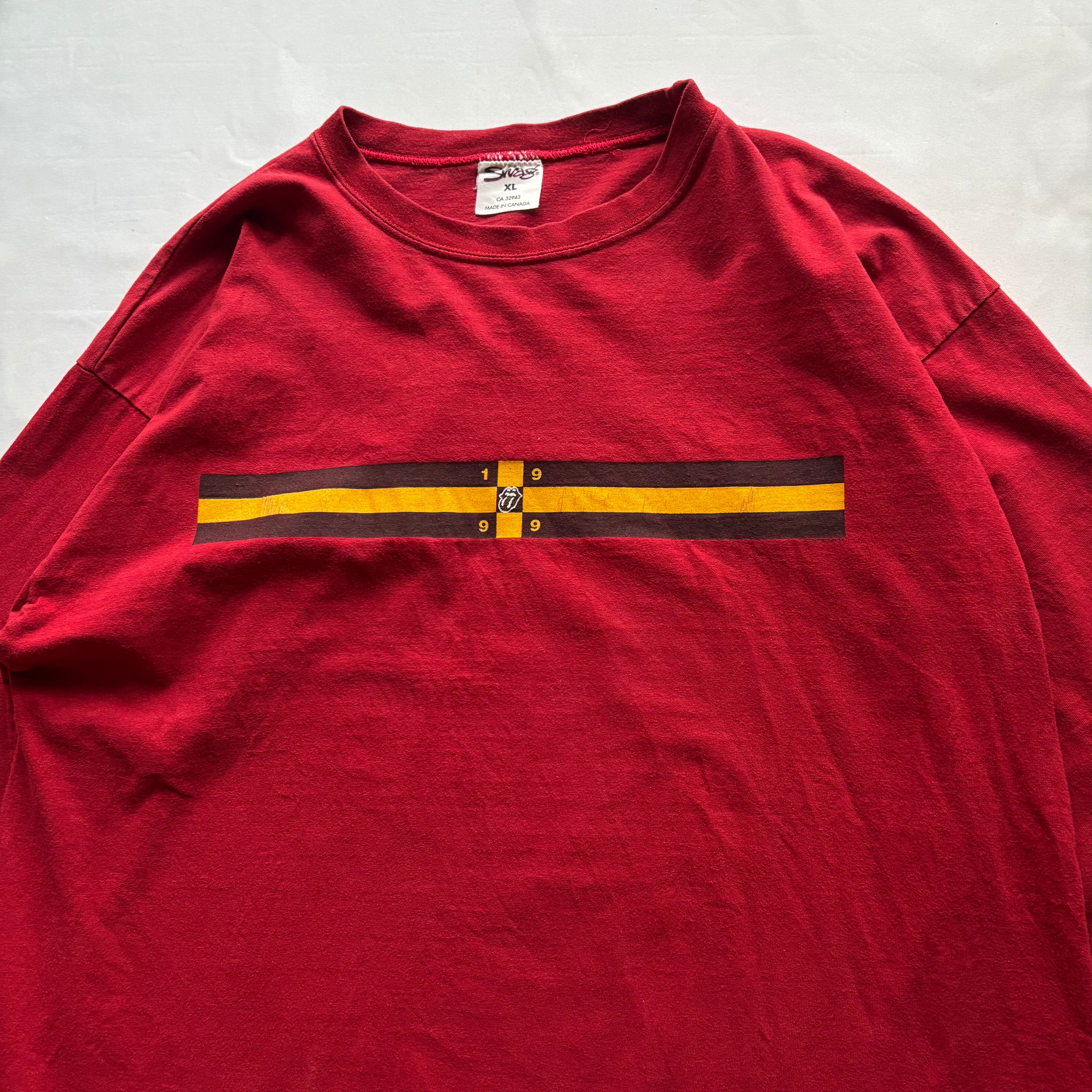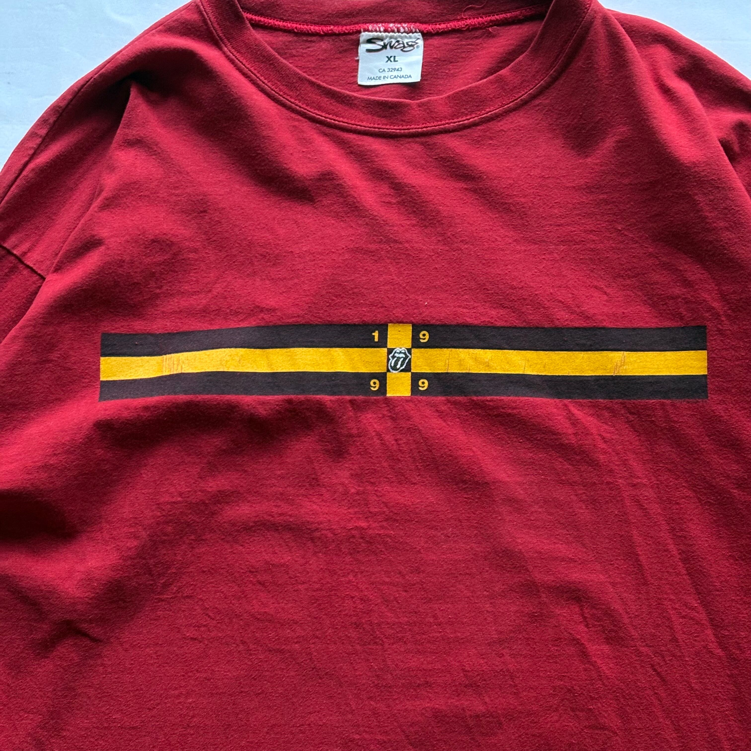 ローリングストーンズらしい目を引くレッドのボディに1999年に開催されたツアー『NO SECURITY TOUR 99』に関する両面プリントが施された当時のマーチャンダイズになります。
