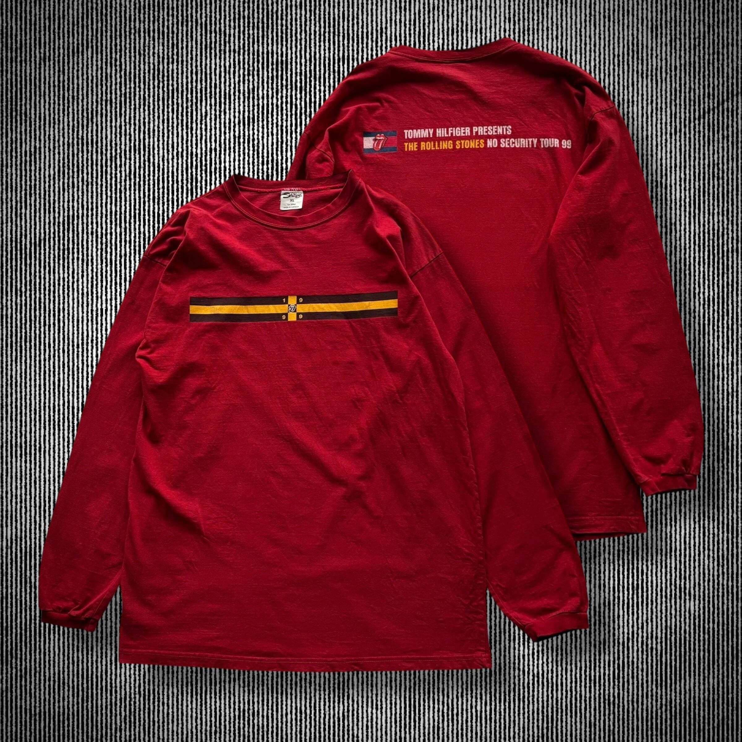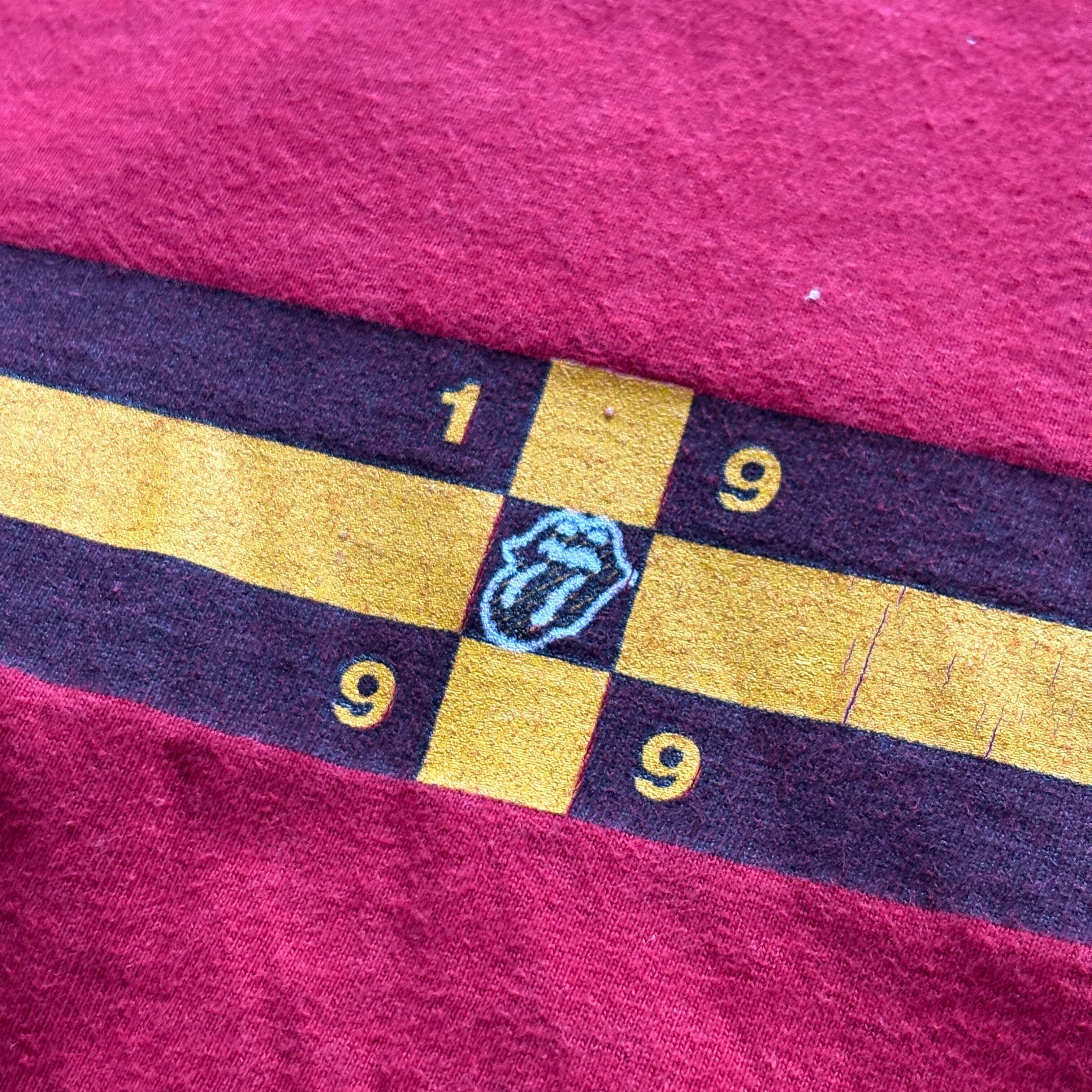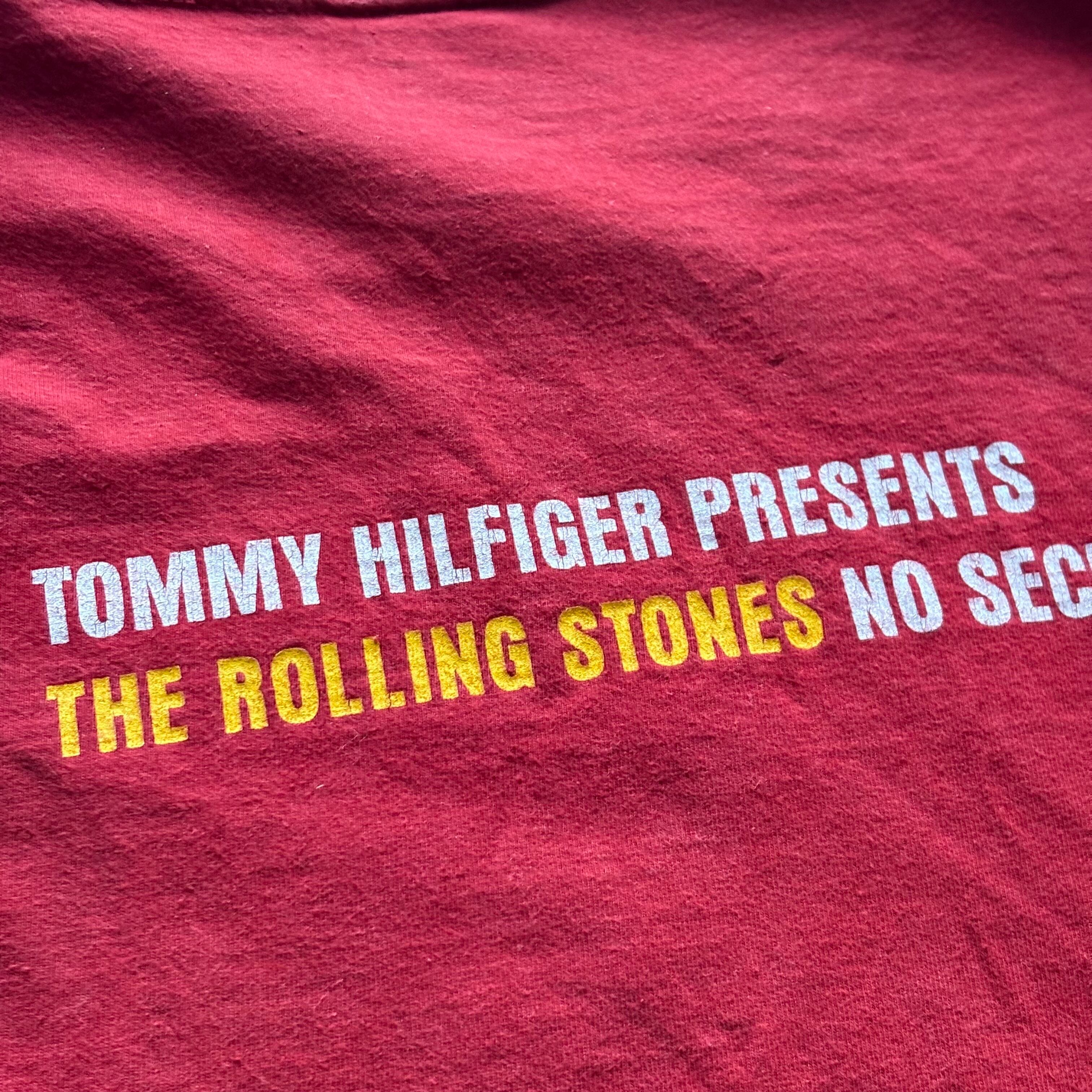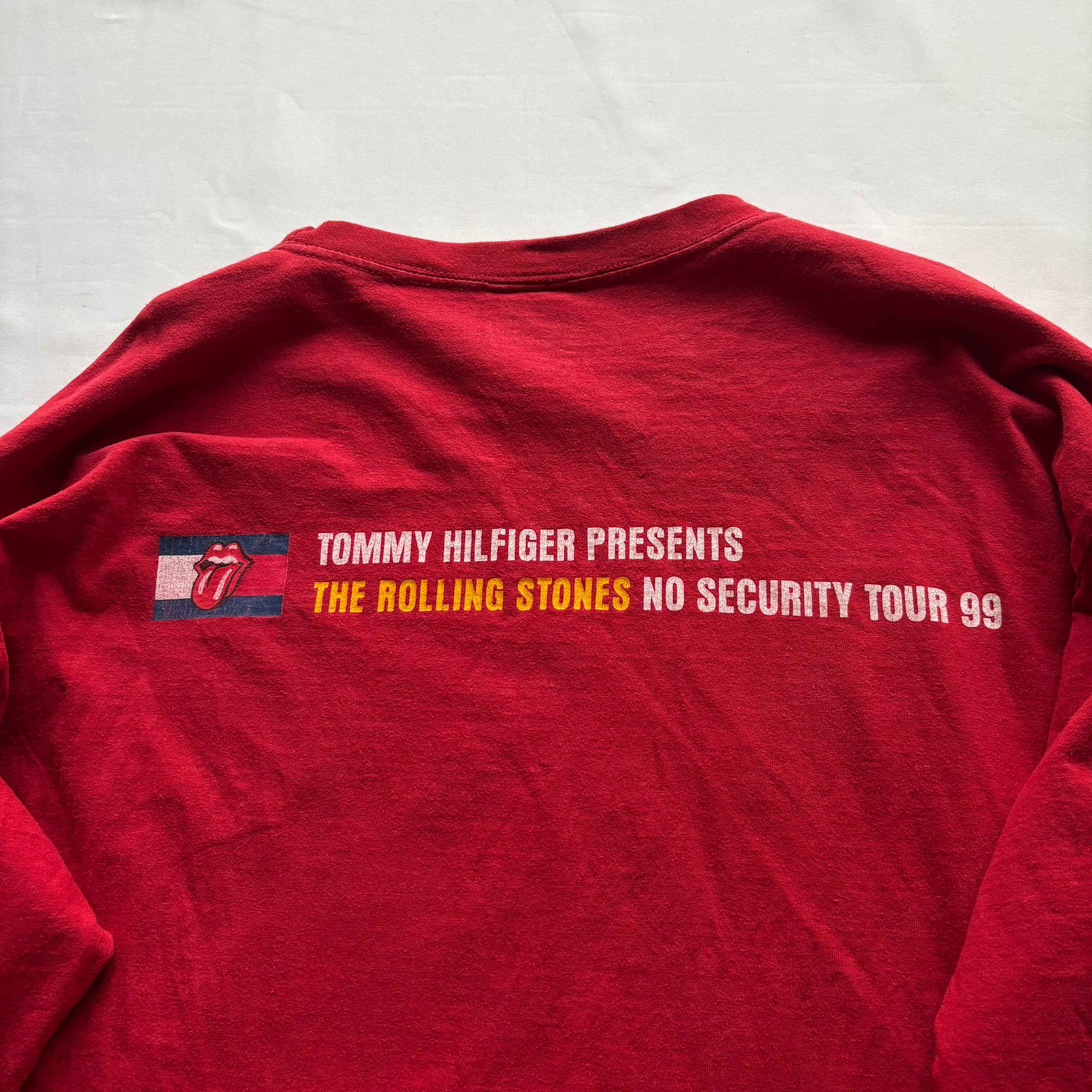 ローリングストーンズらしい目を引くレッドのボディに1999年に開催されたツアー『NO SECURITY TOUR 99』に関する両面プリントが施された当時のマーチャンダイズになります。