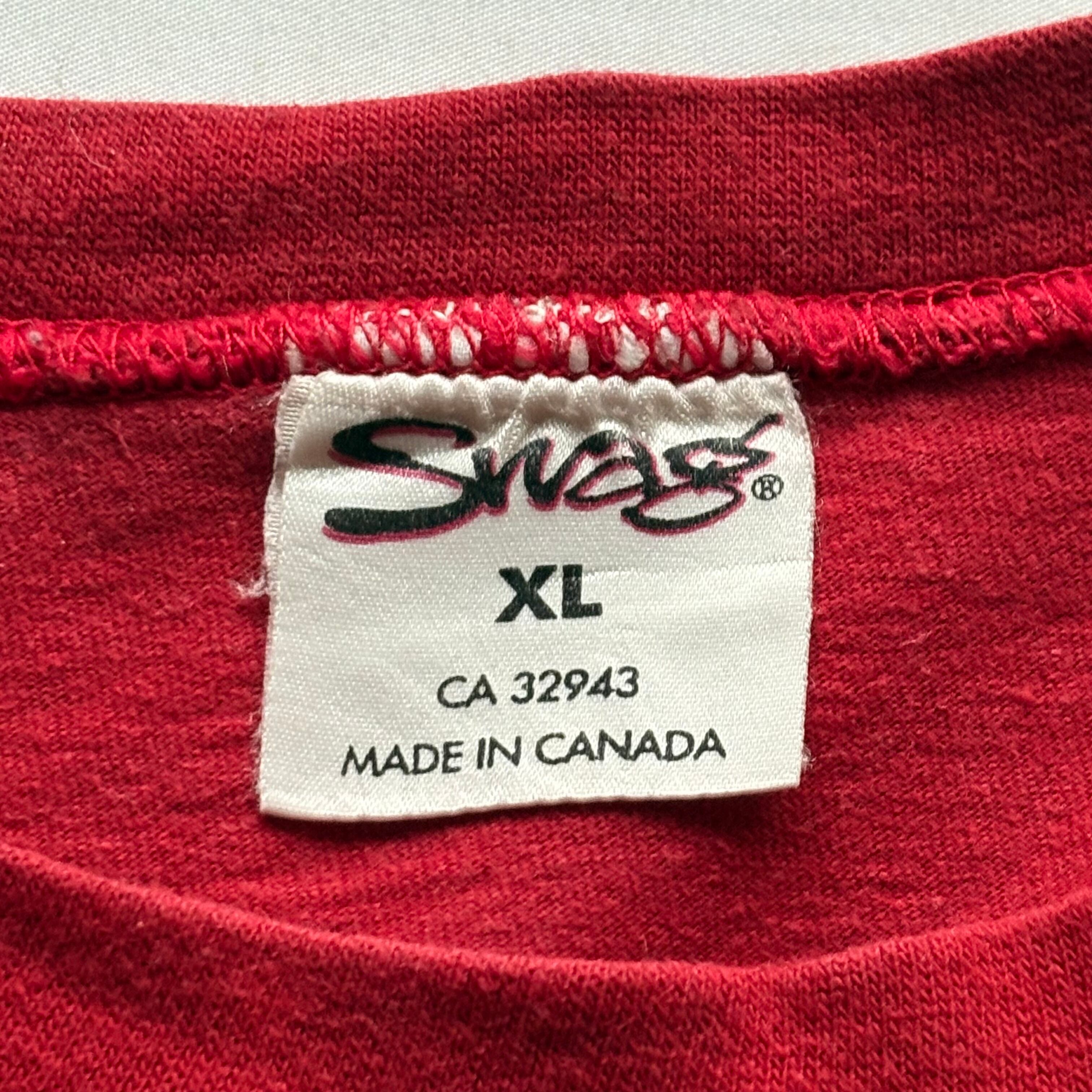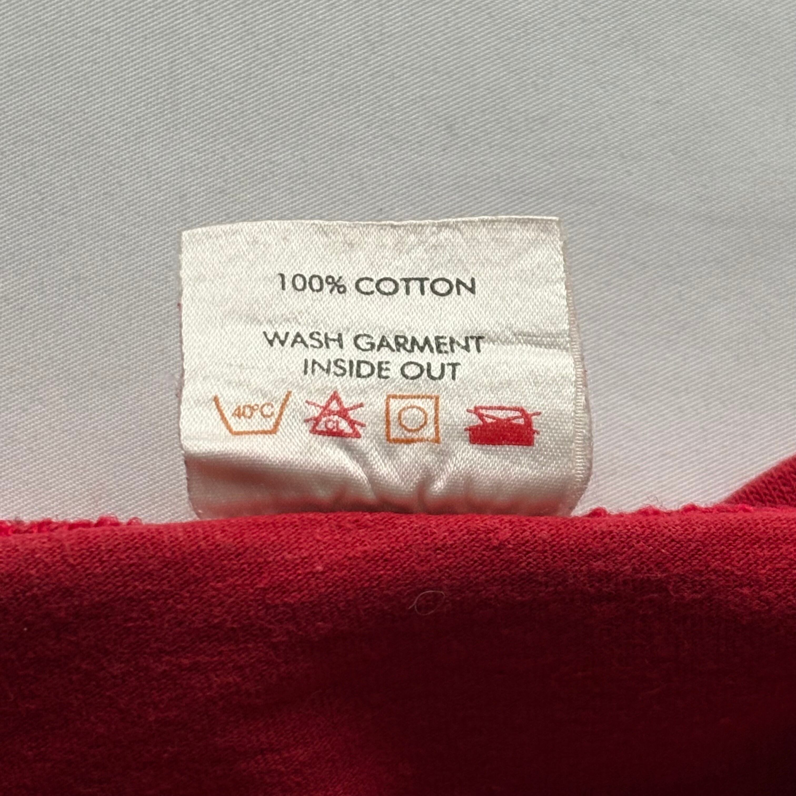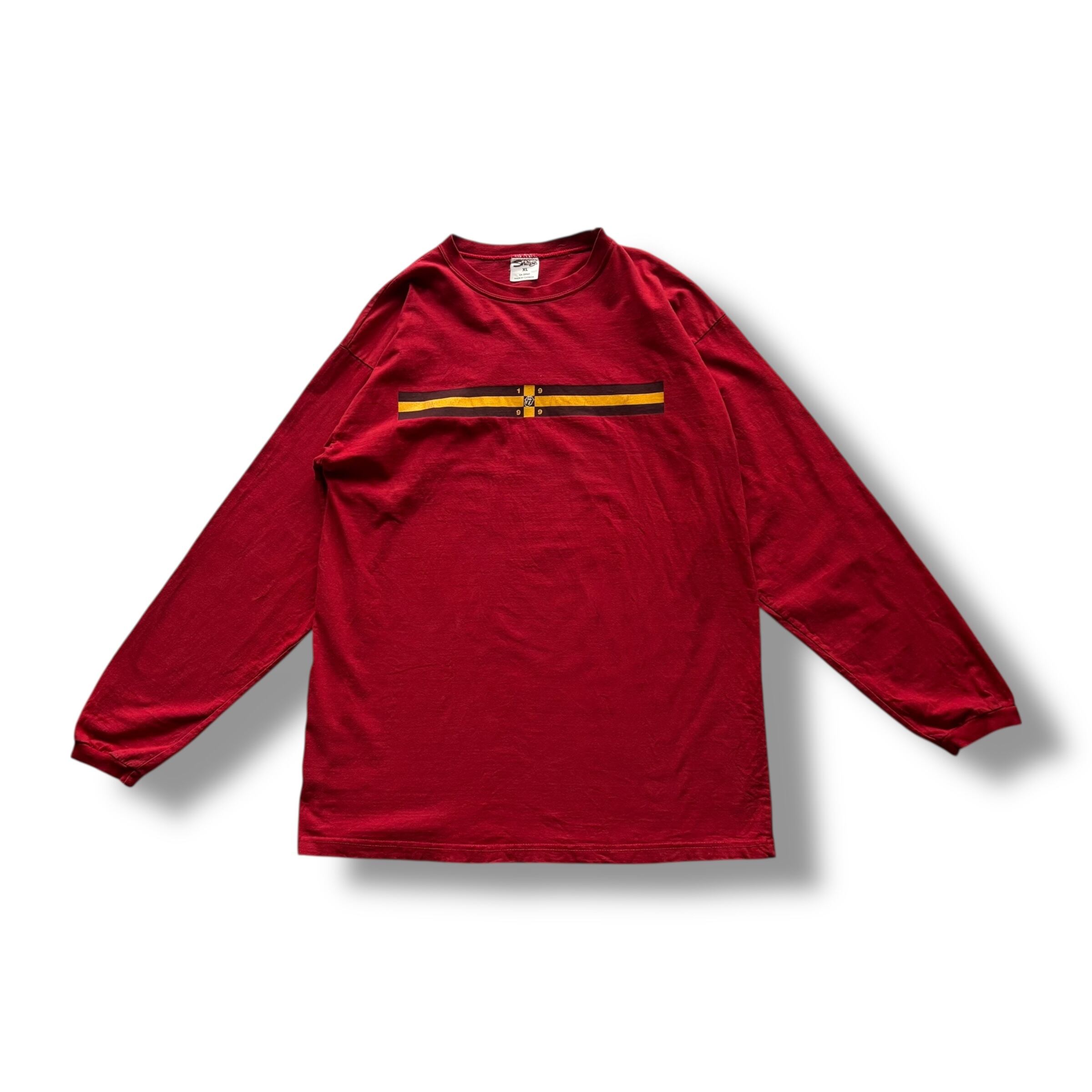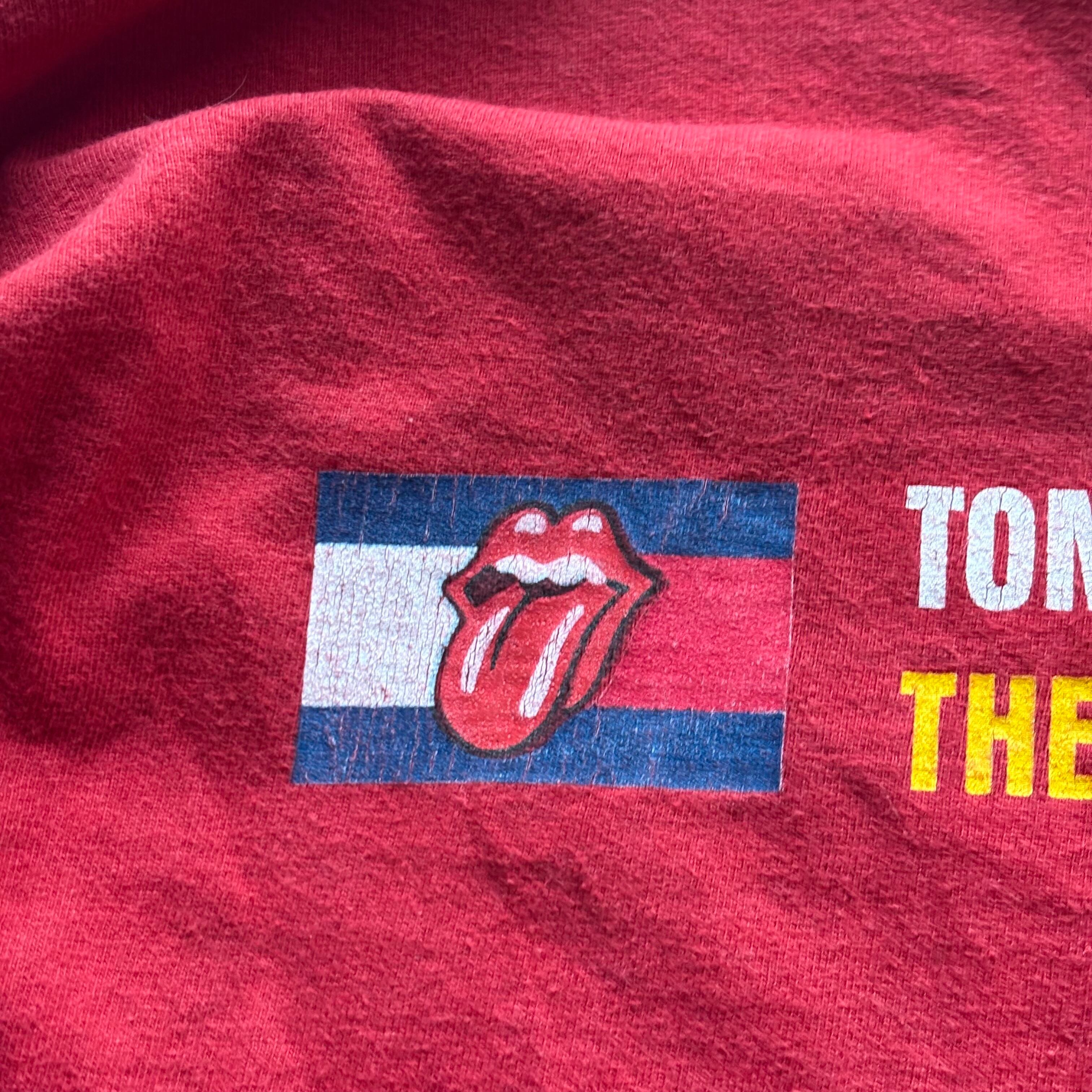 ローリングストーンズらしい目を引くレッドのボディに1999年に開催されたツアー『NO SECURITY TOUR 99』に関する両面プリントが施された当時のマーチャンダイズになります。