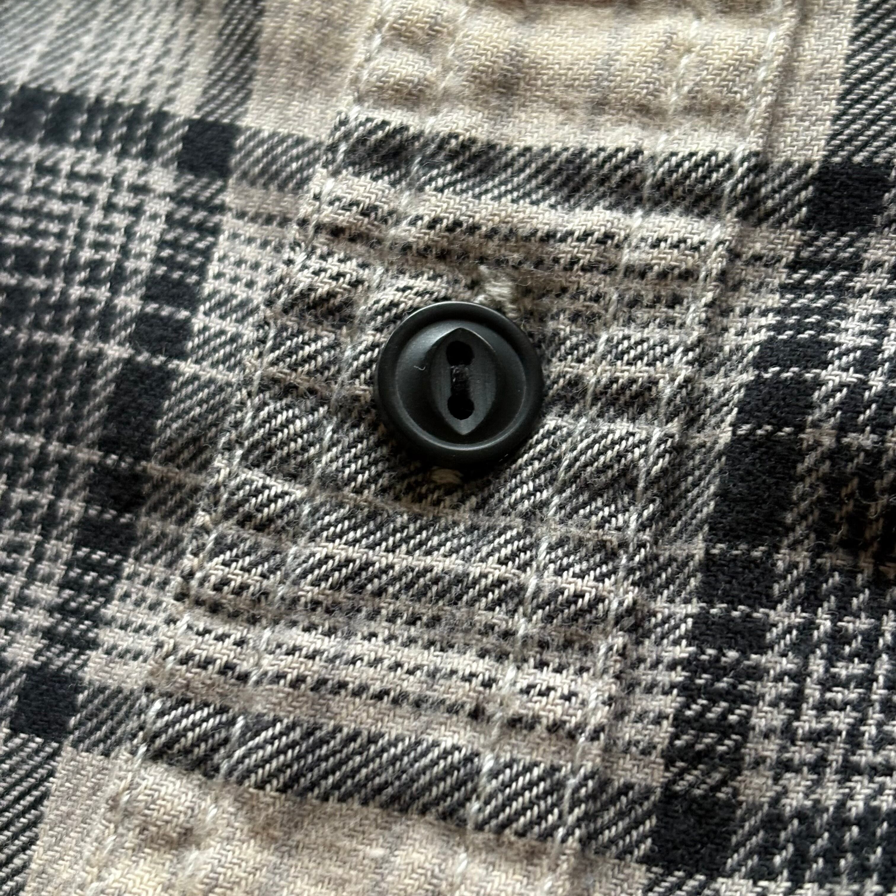 細部にこだわりを感じるディテールが詰め込まれており、ボタンホール直下の裾部分にあるスクエア型のロゴパッチや全てのボタンに猫目ボタンが採用されている点などオンブレチェックを差し引いても満足度の高いアイテムに仕上がっています。