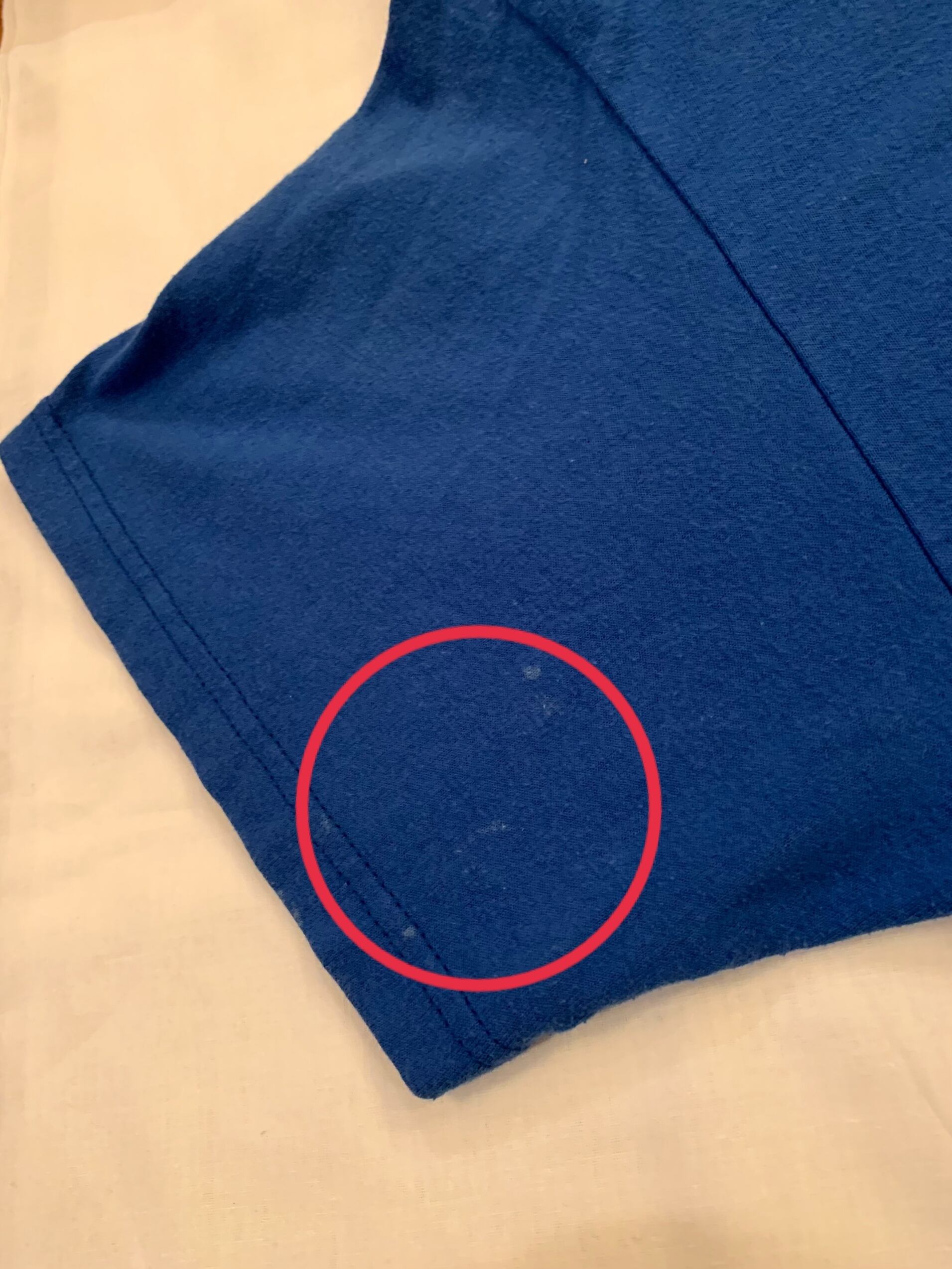【状態】プリント割れ、ボディに若干の伸びあり、左袖背面汚れ(写真参照)