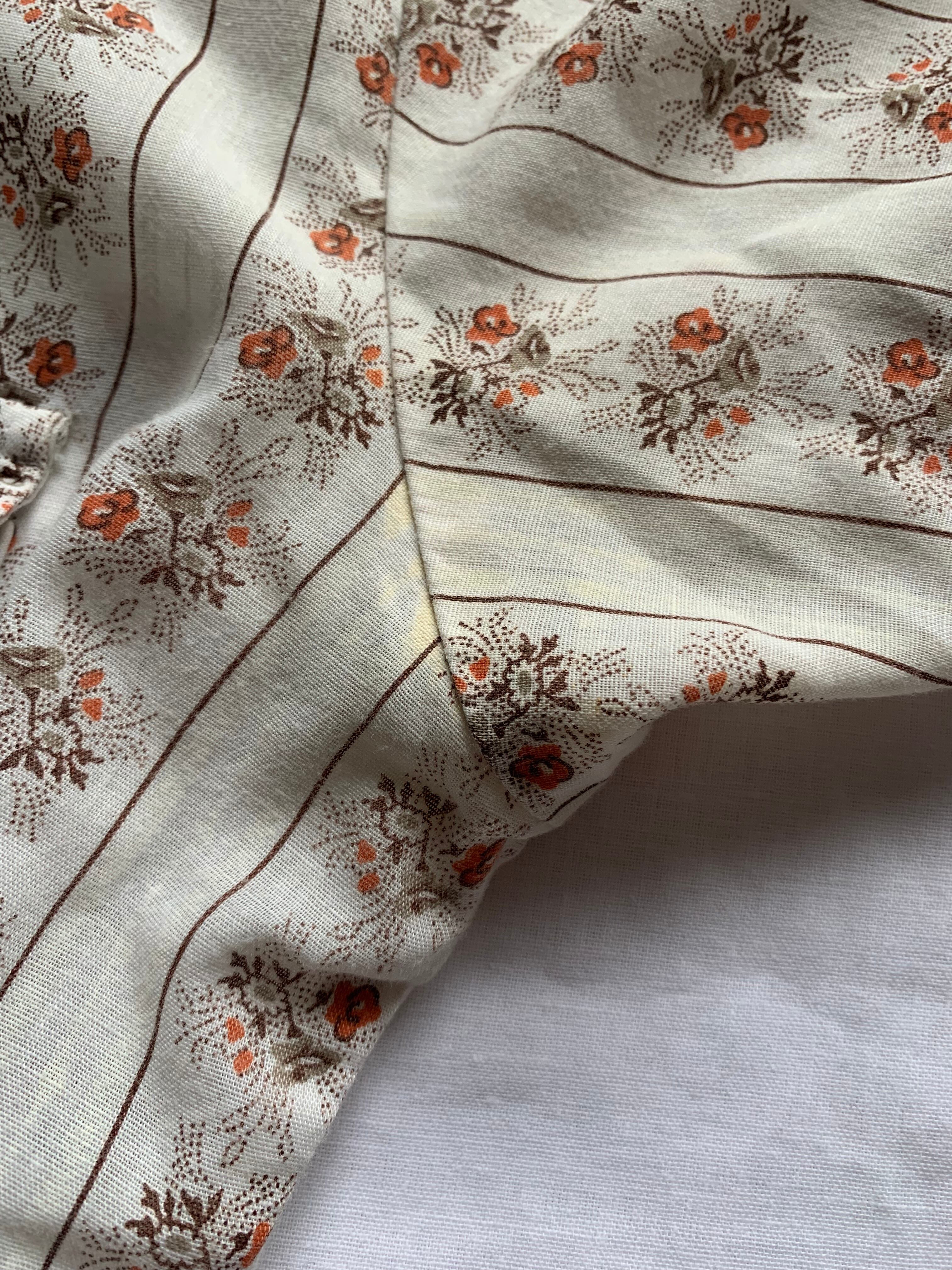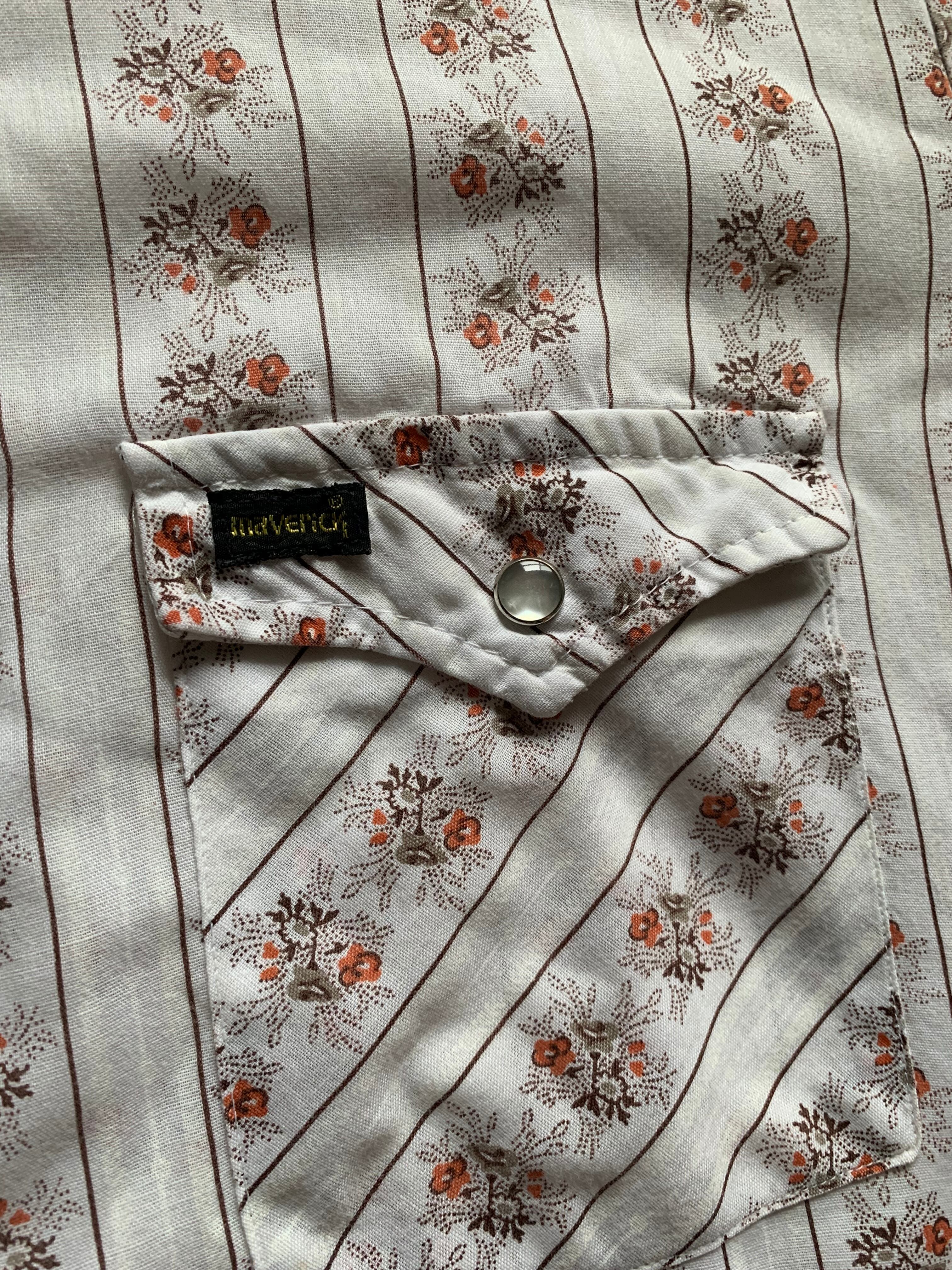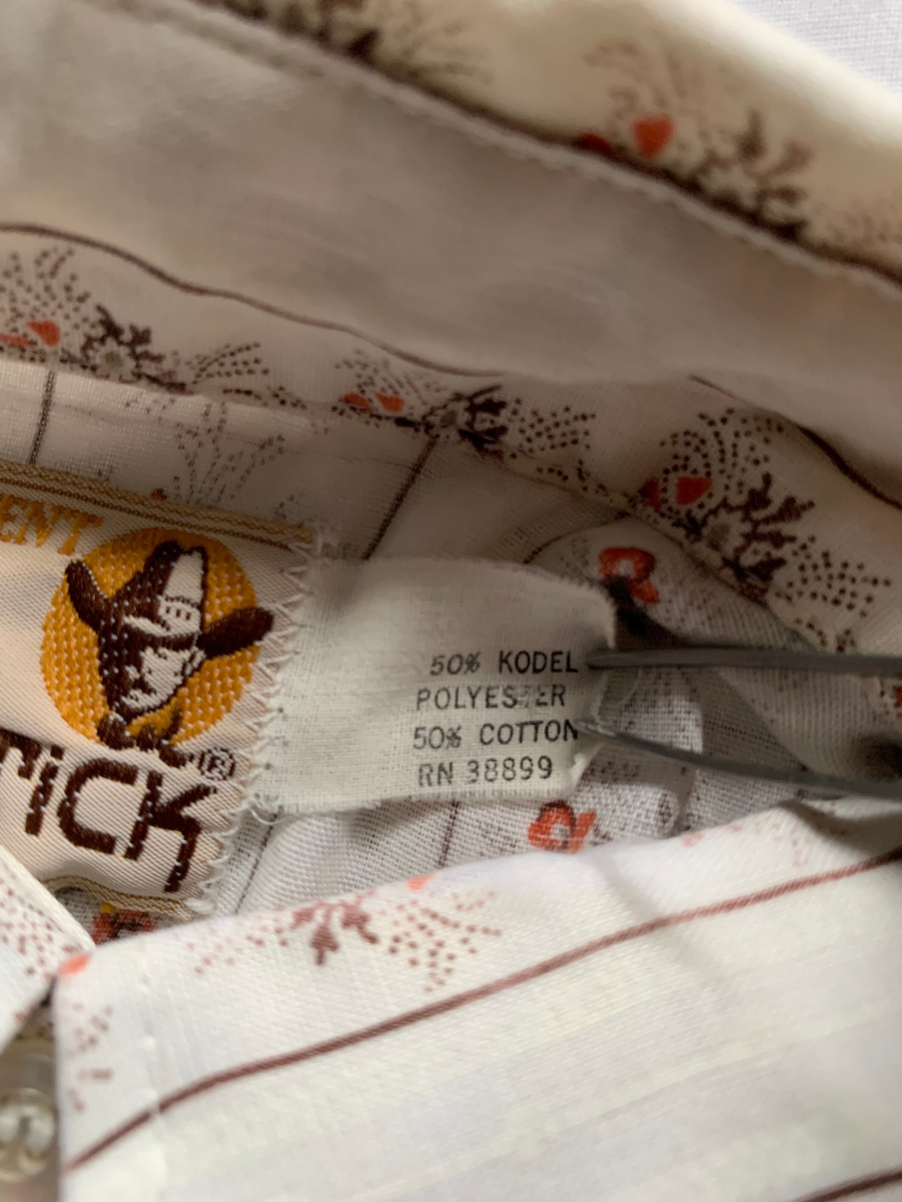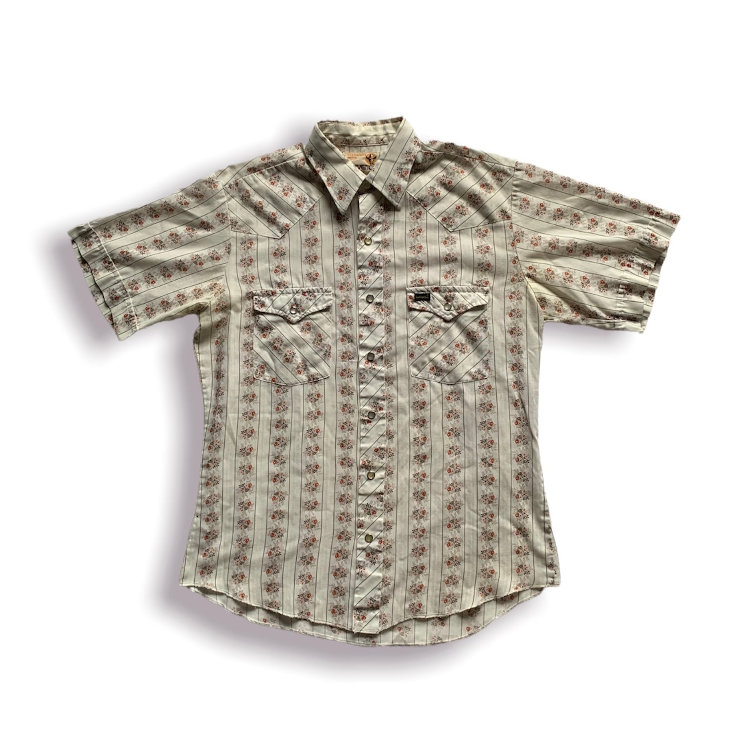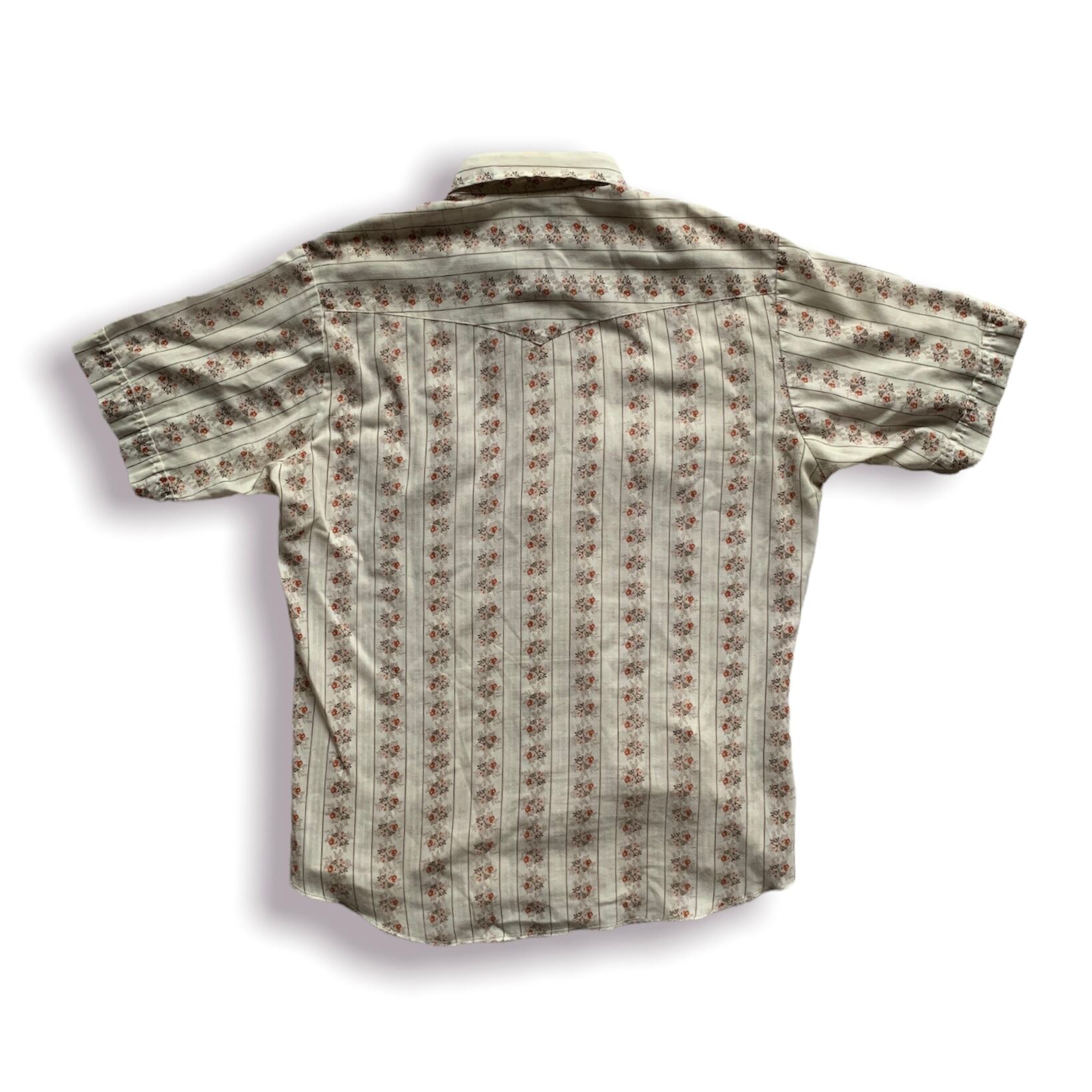 花柄の模様がストライプ状に並列しており、レトロな雰囲気がある一着です。ウエスタンアイテムに定評のあるこのブランドらしいカウボーイタグなどディテールも魅力的ですね。