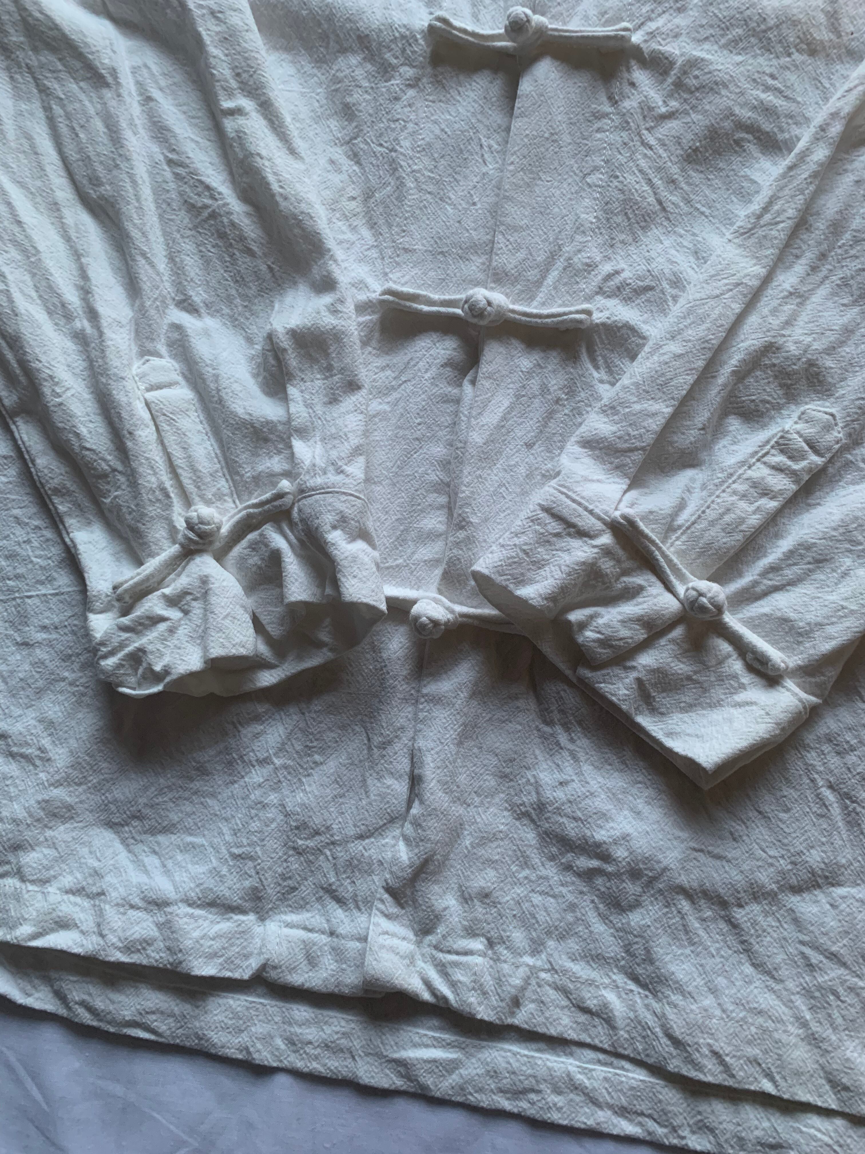 チャイナシャツの最大の魅力であるユニークなフォルムをお楽しみ頂ける一着です。オフホワイトのカラーリングが爽やかな印象を与えてくれます。