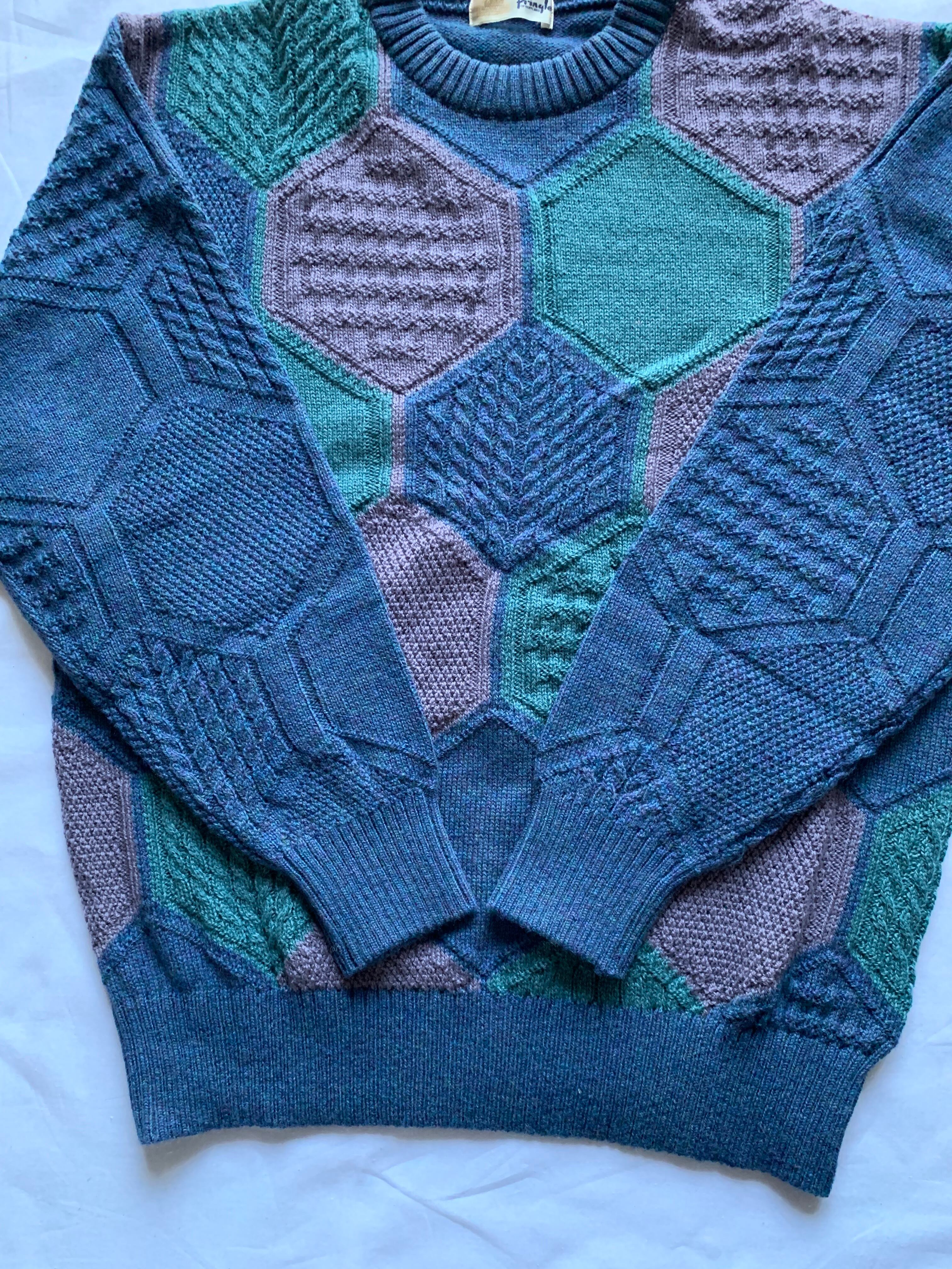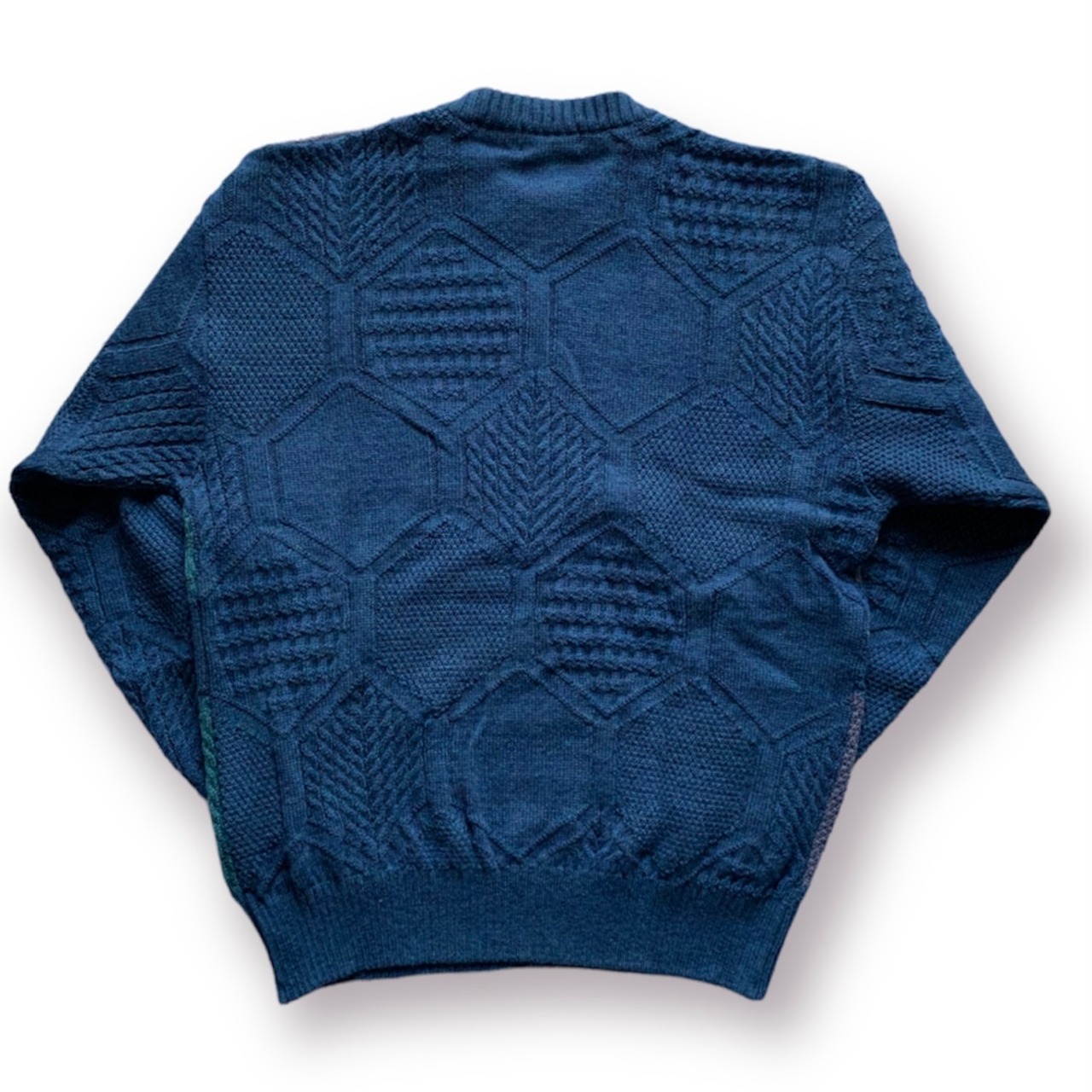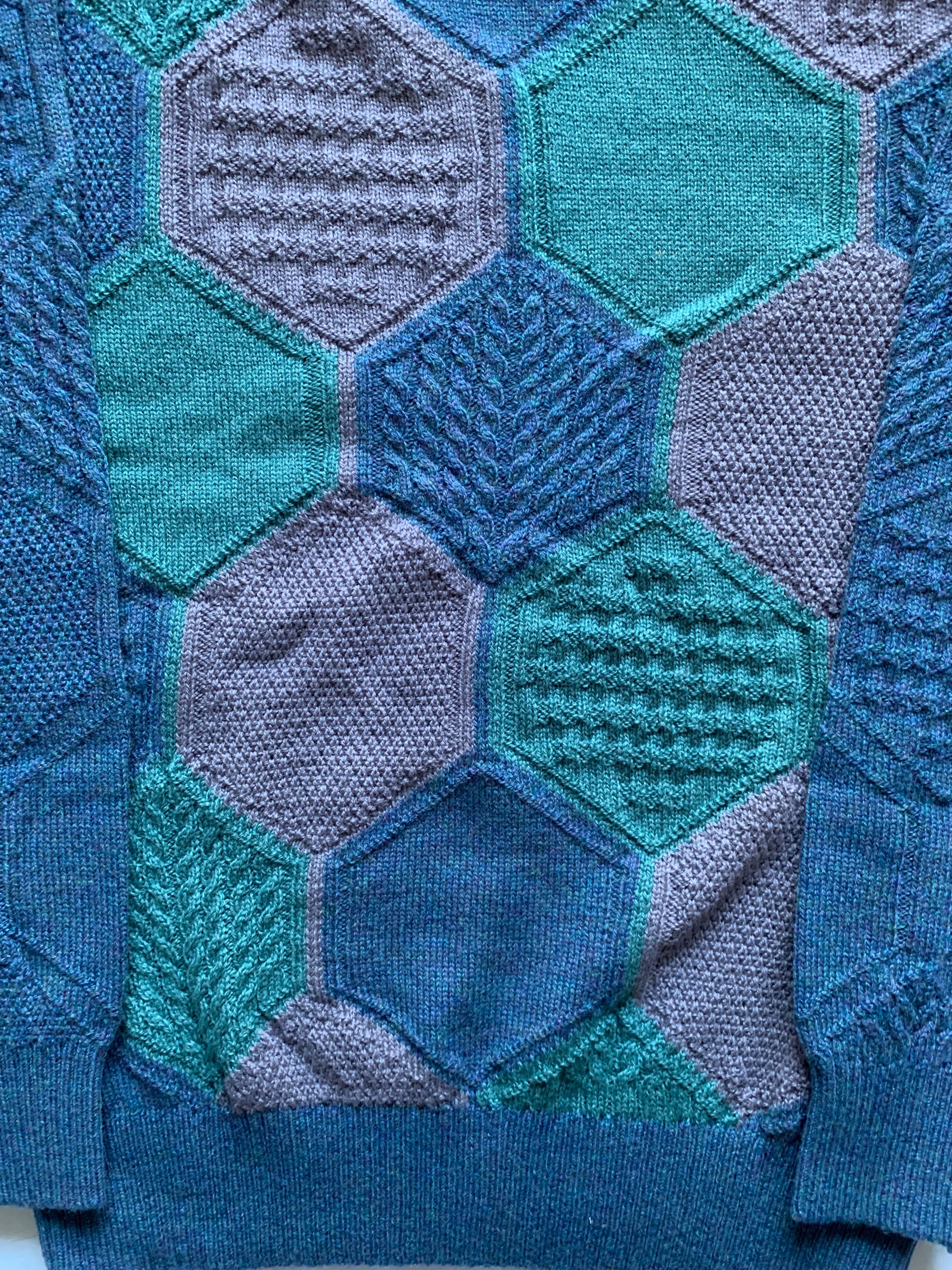 立体感のある六角形が連続した幾何学模様と涼しげな色味がマッチしたレトロな風合いの一着です。