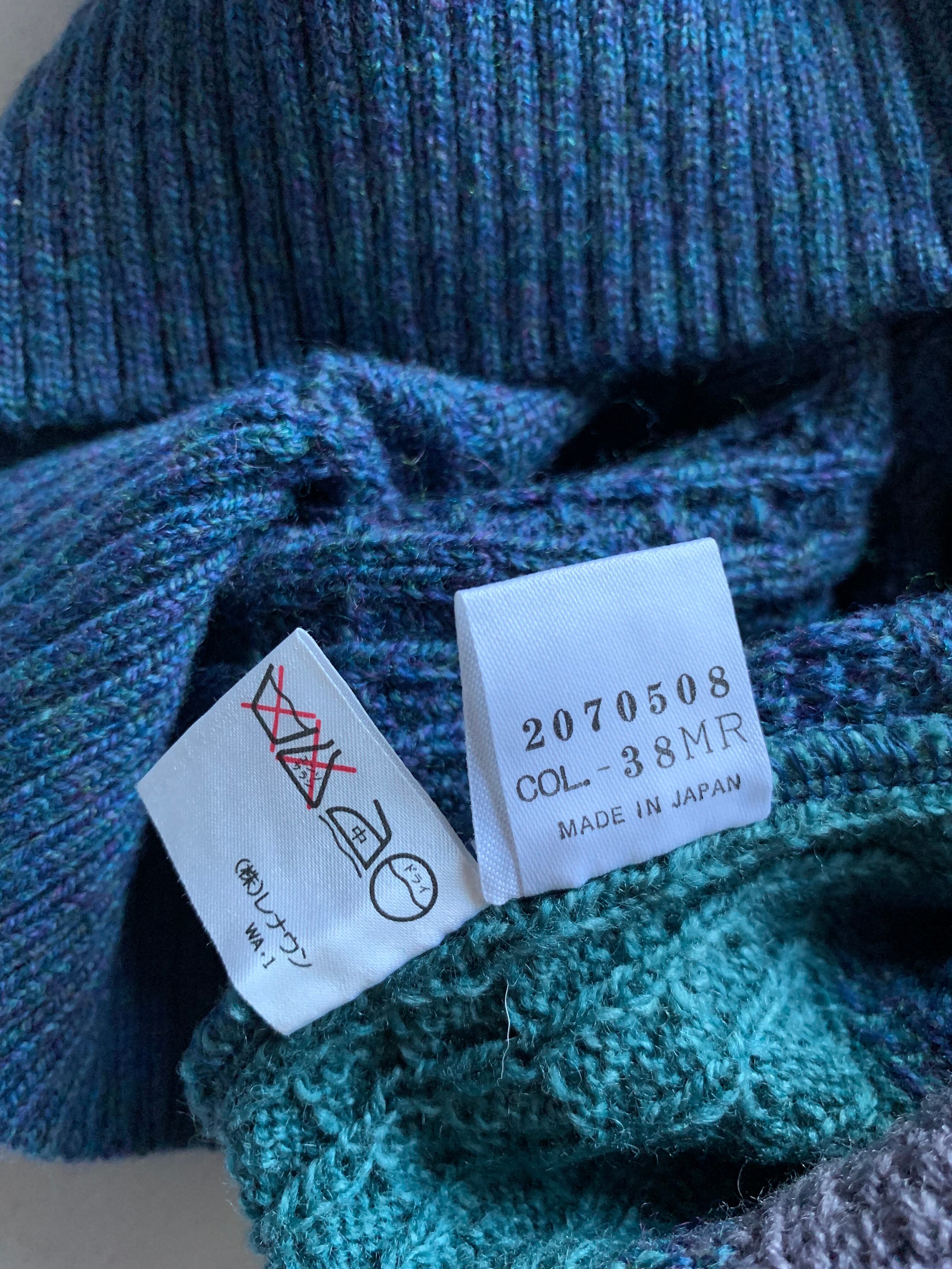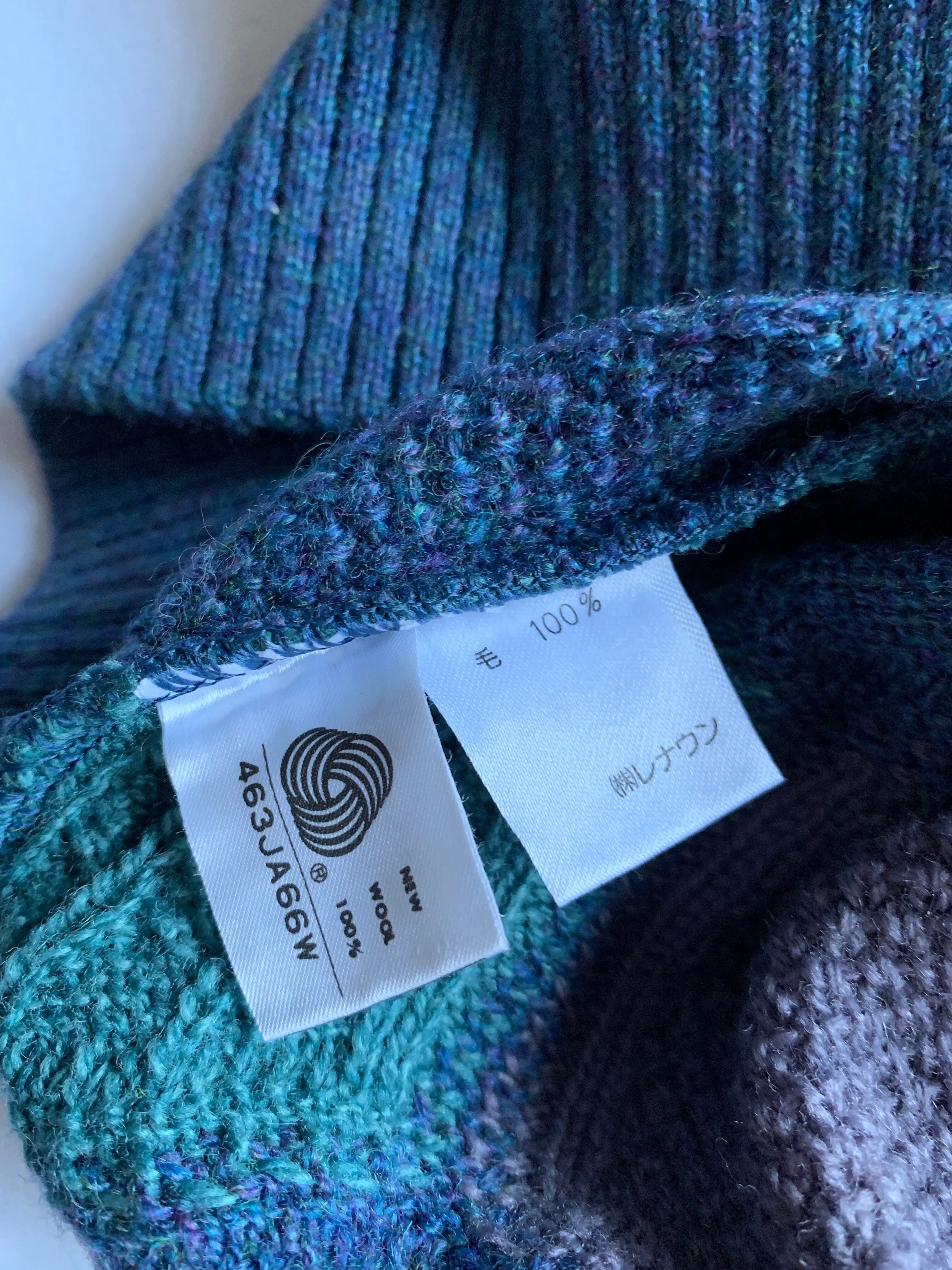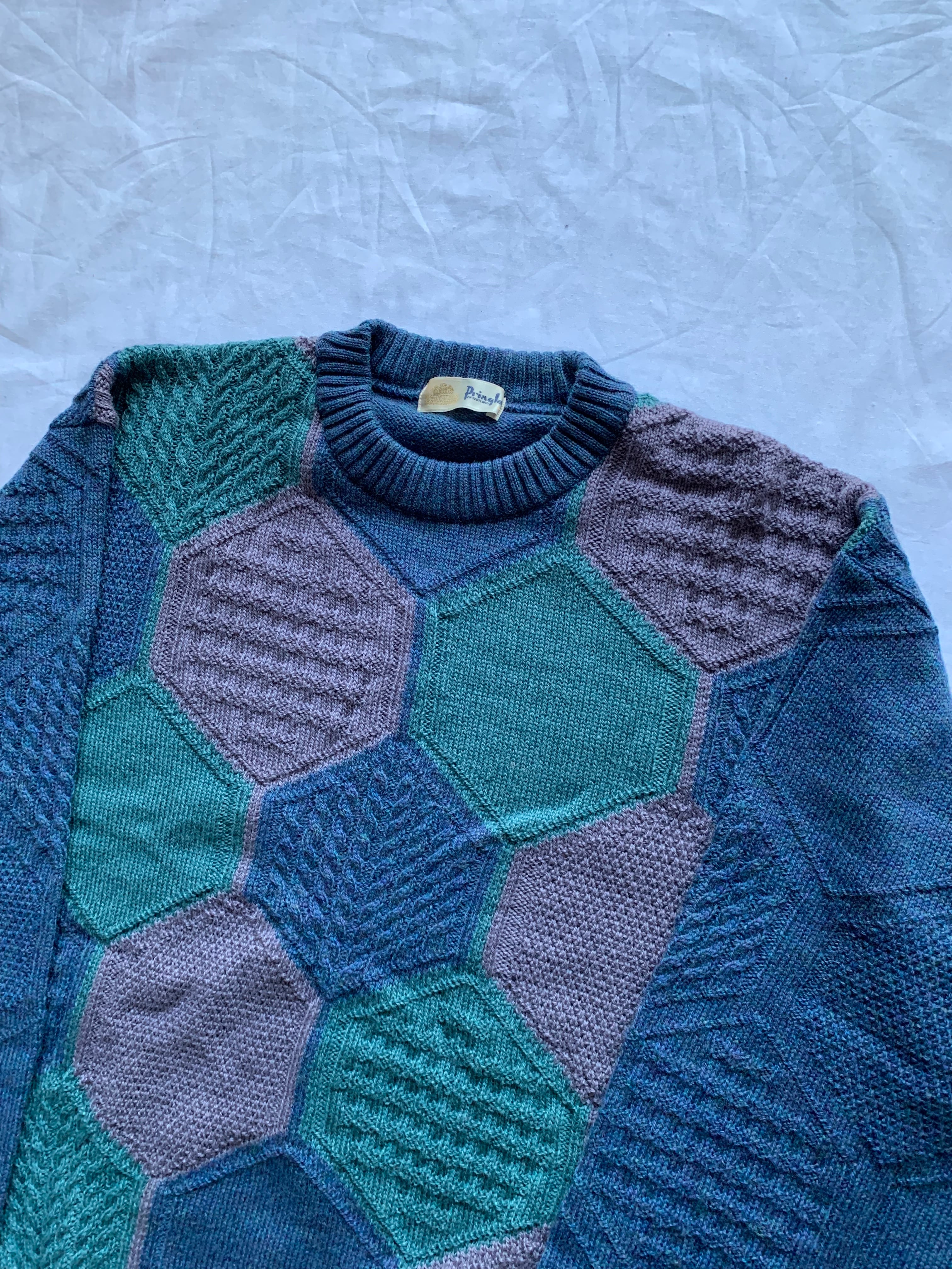 立体感のある六角形が連続した幾何学模様と涼しげな色味がマッチしたレトロな風合いの一着です。