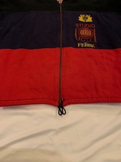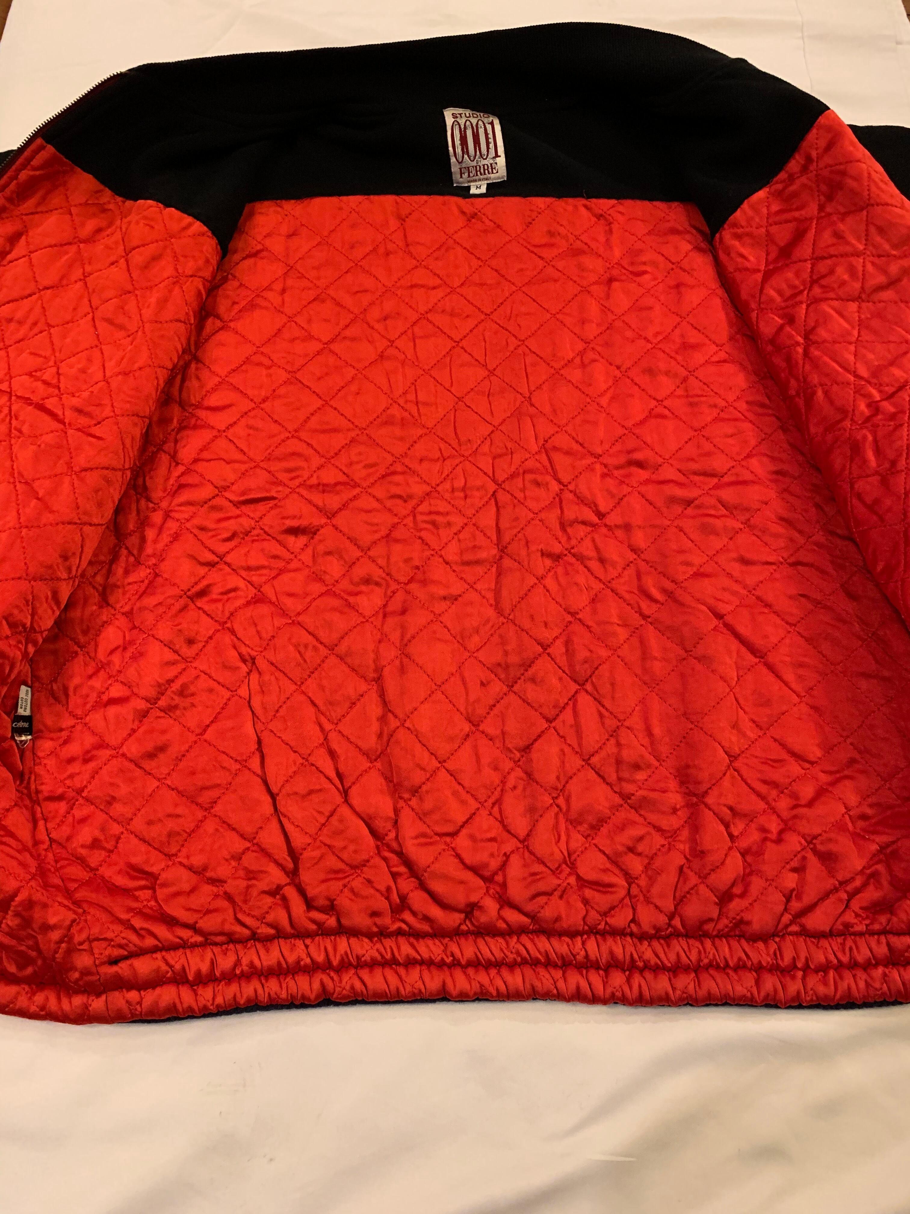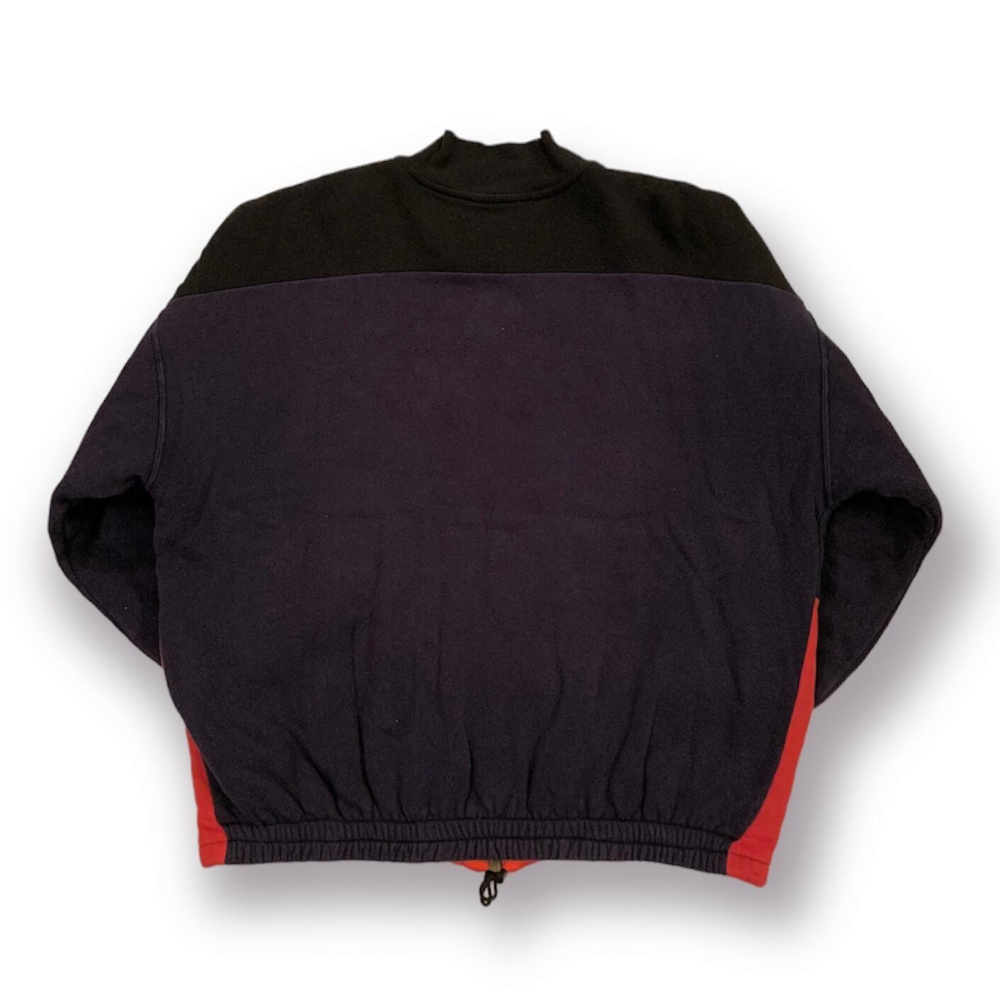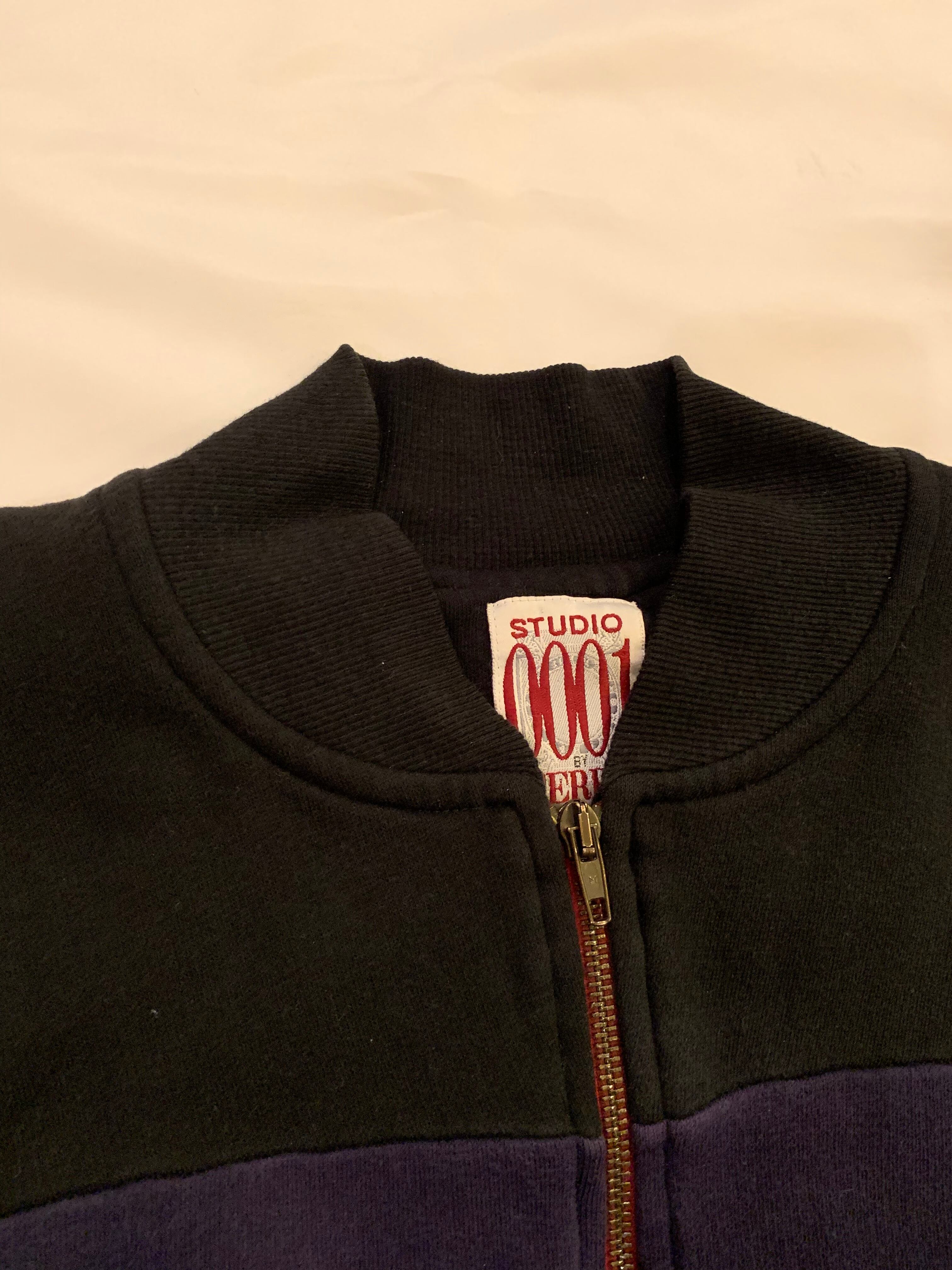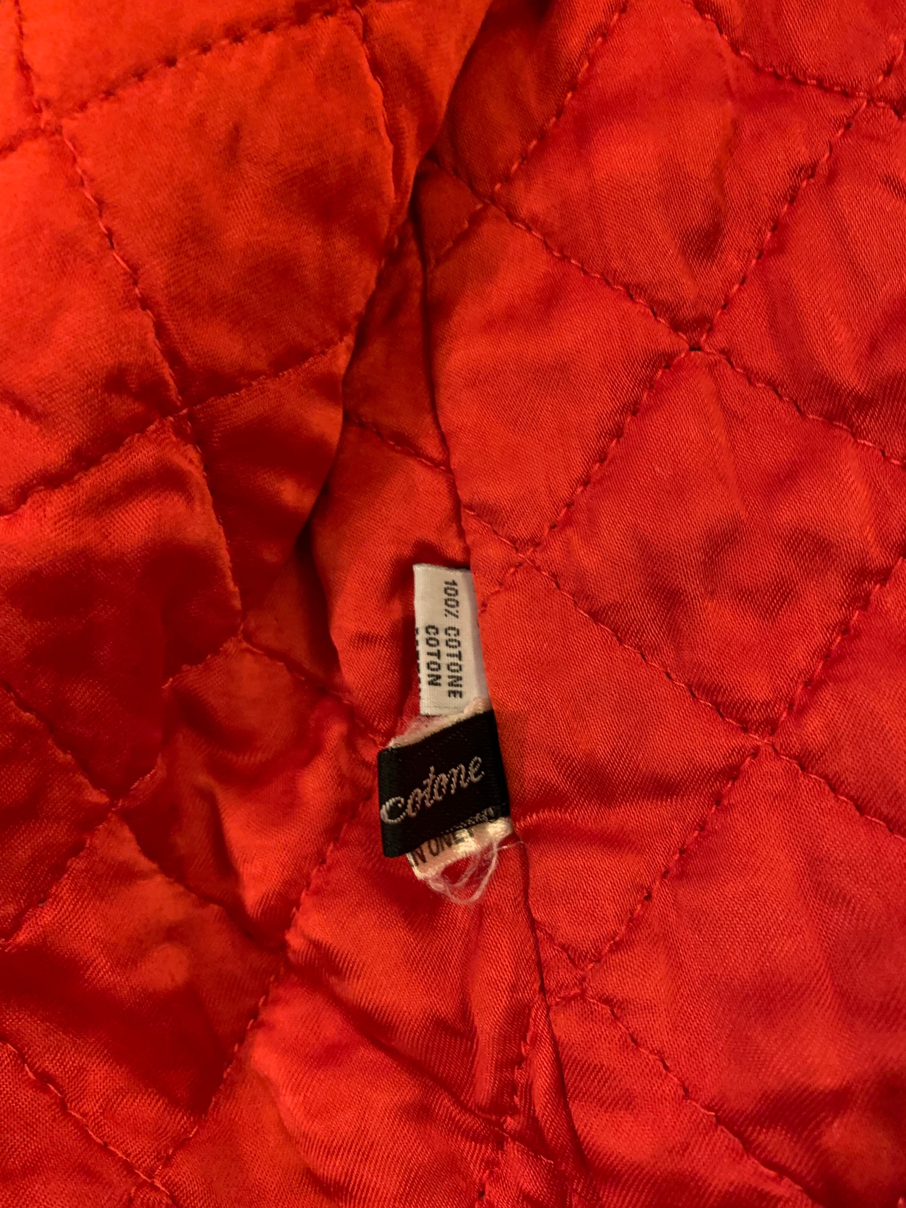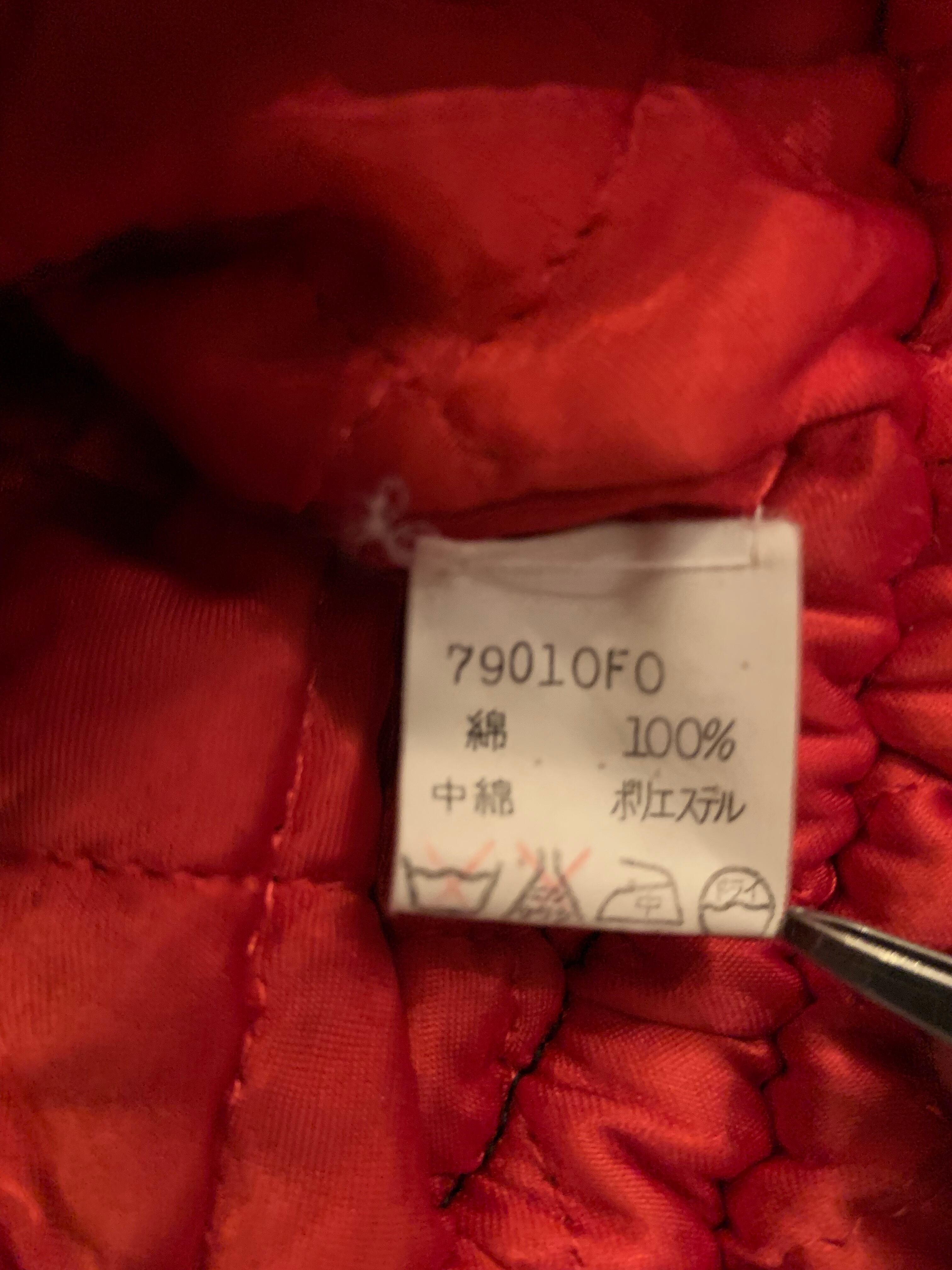 表地はブラック、パープル、レッドの3色の切替が効いたスウェット生地、裏地は鮮やかなレッドのキルティングになっており、中綿が入っています。
