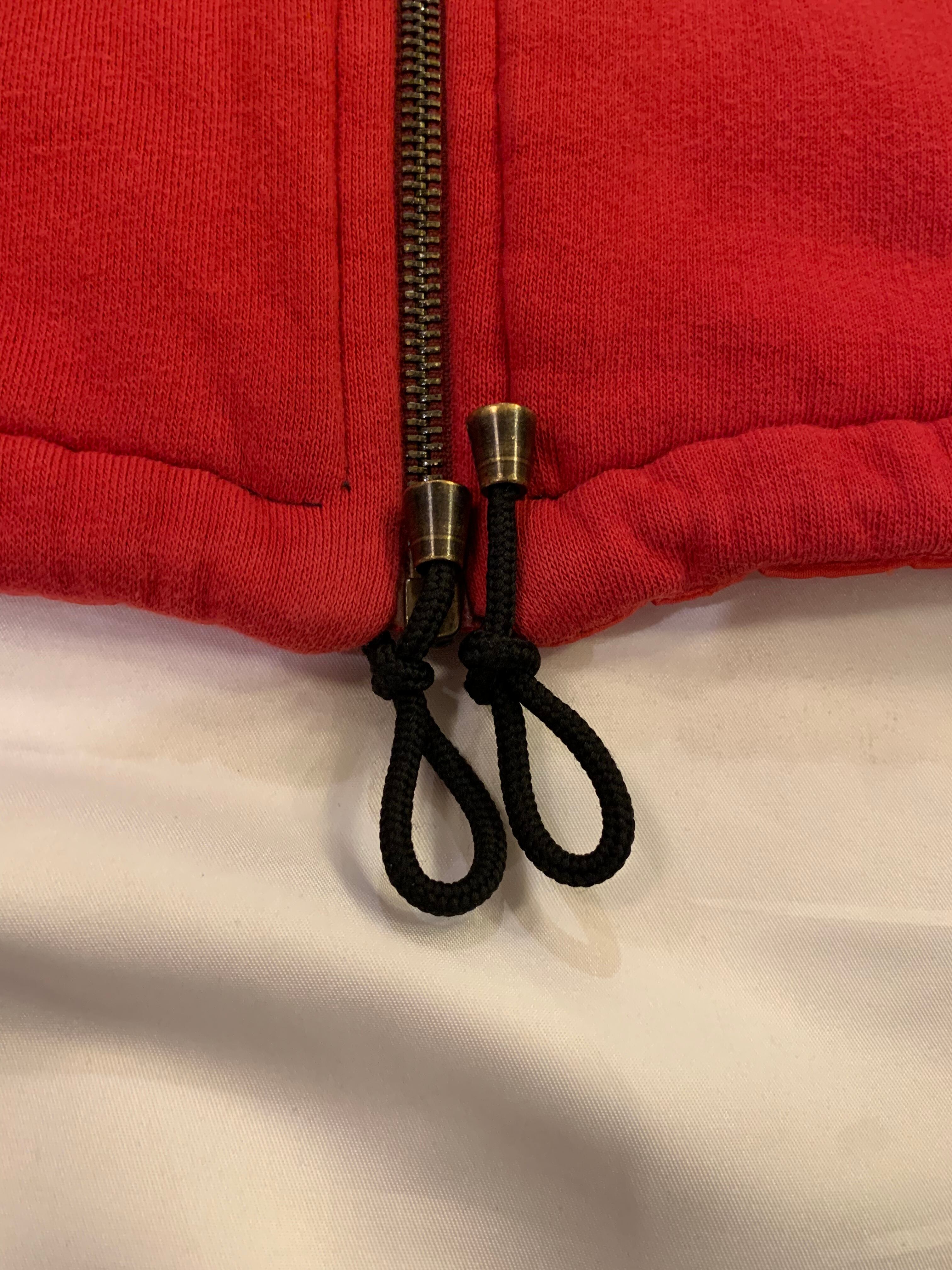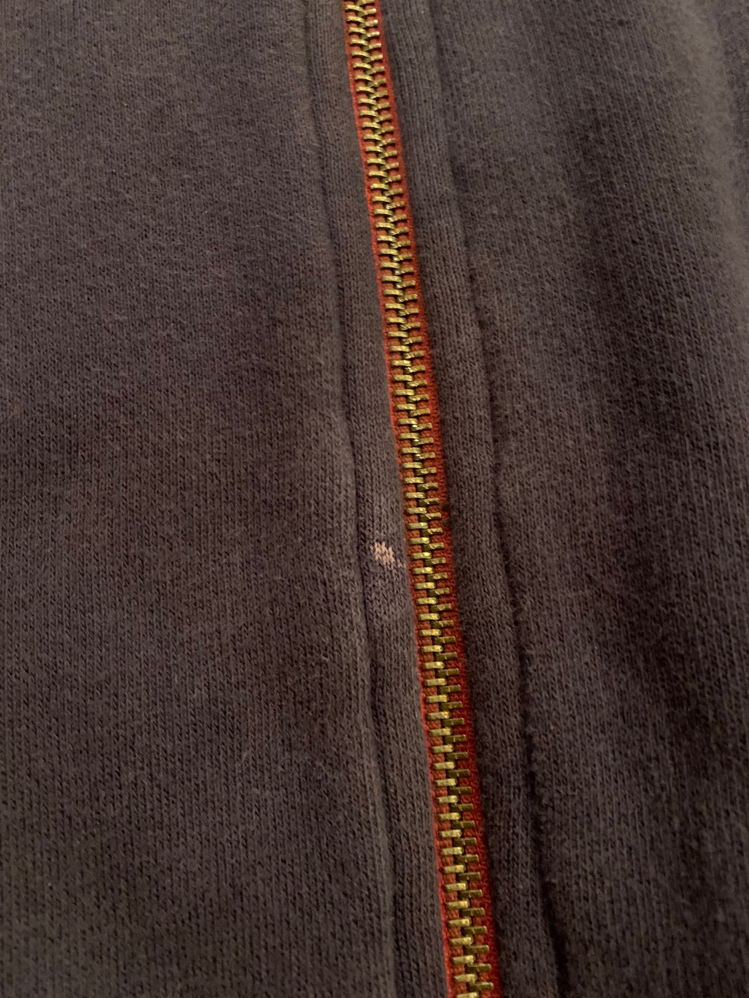 【状態】全体的に若干の色味のフェード感あり、前身頃中央ジップ付近に色落ちあり、品質表示タグ縫い糸ほつれあり(写真参照)