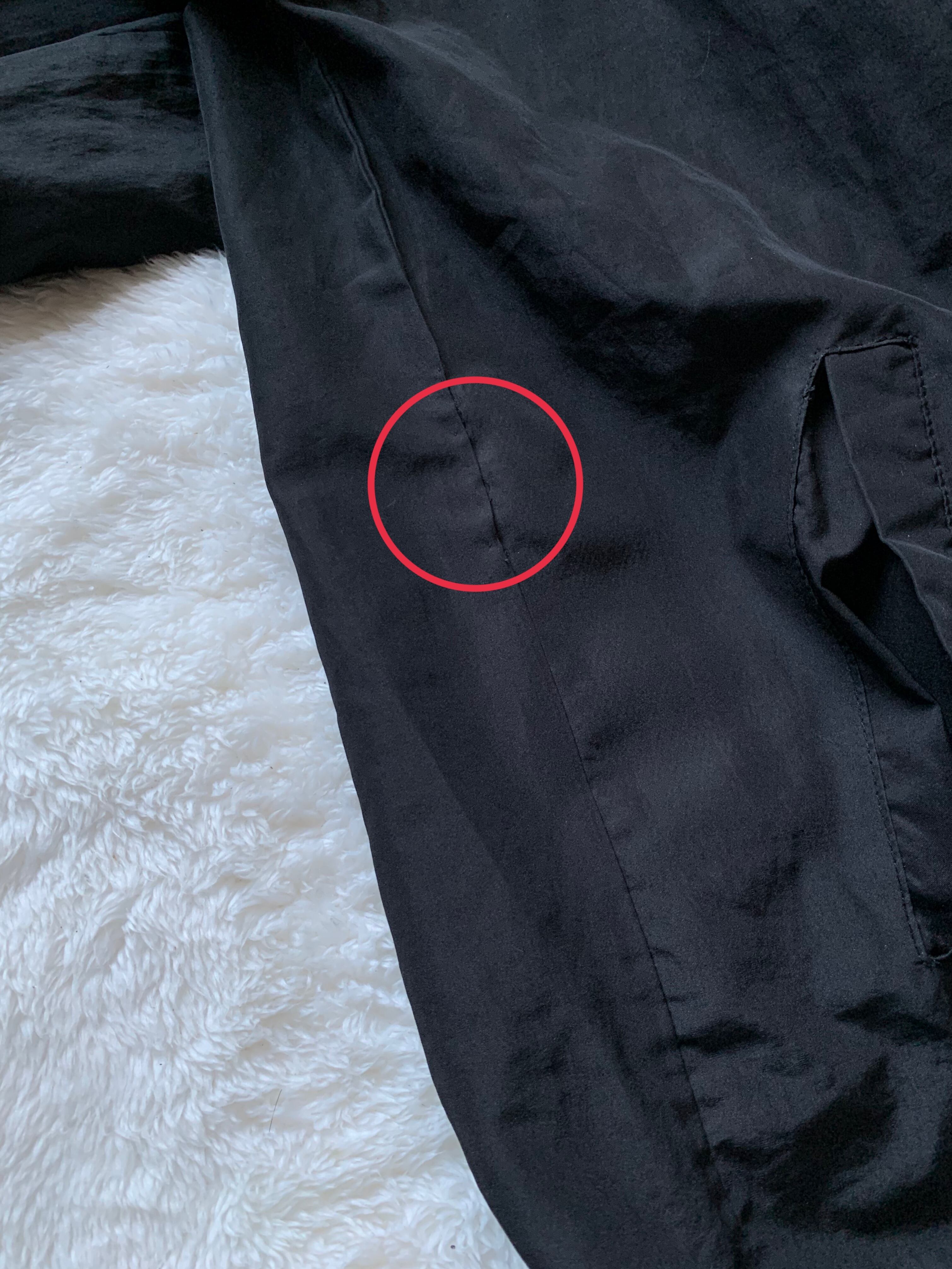 【状態】身頃右脇下と左側面裾付近に補修跡あり、内側裏地に全面的にほつれあり(写真参照)