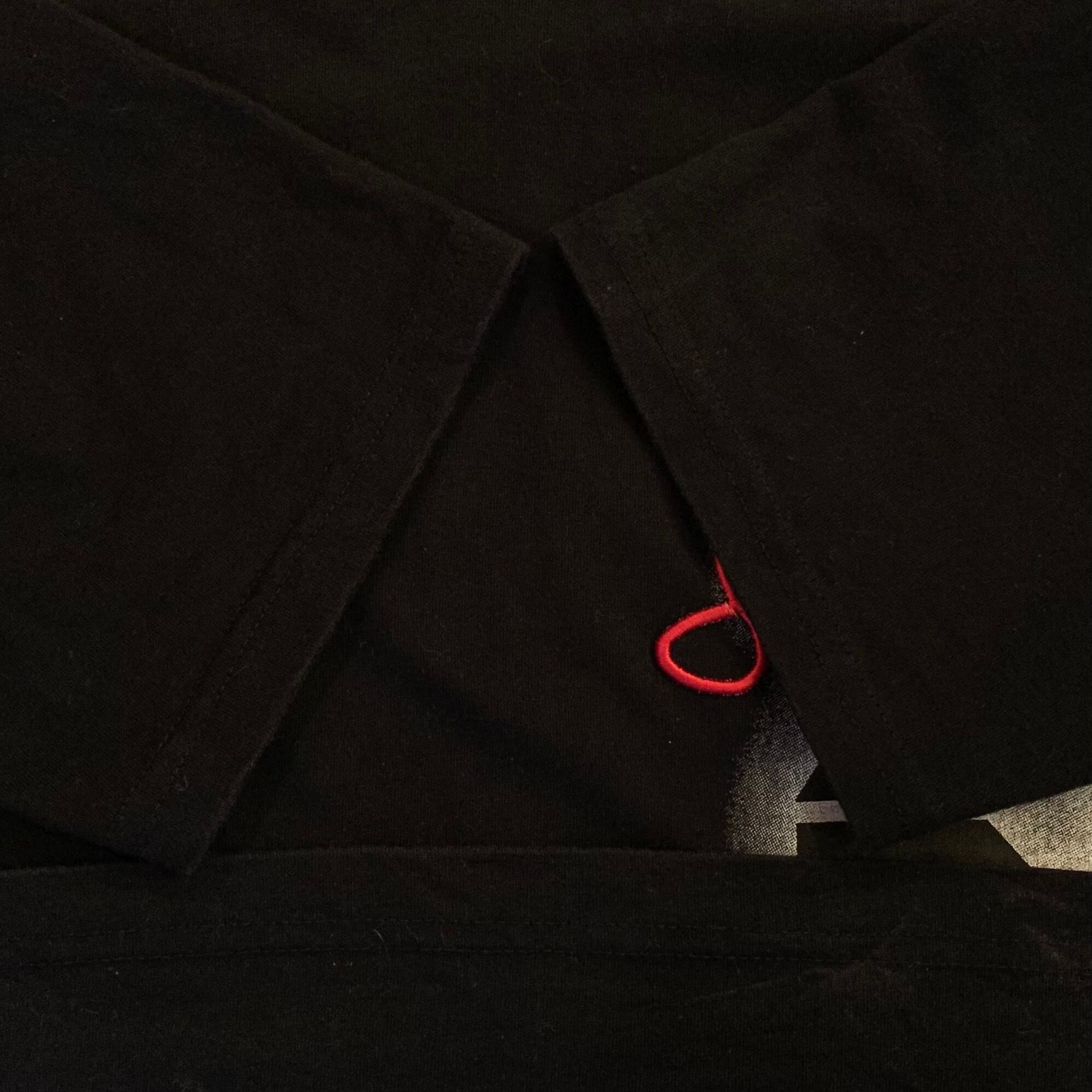 フロント部分のプリント上には赤いロゴ刺繍も施されており、Tシャツとしては手が込んだアイテムという印象です。