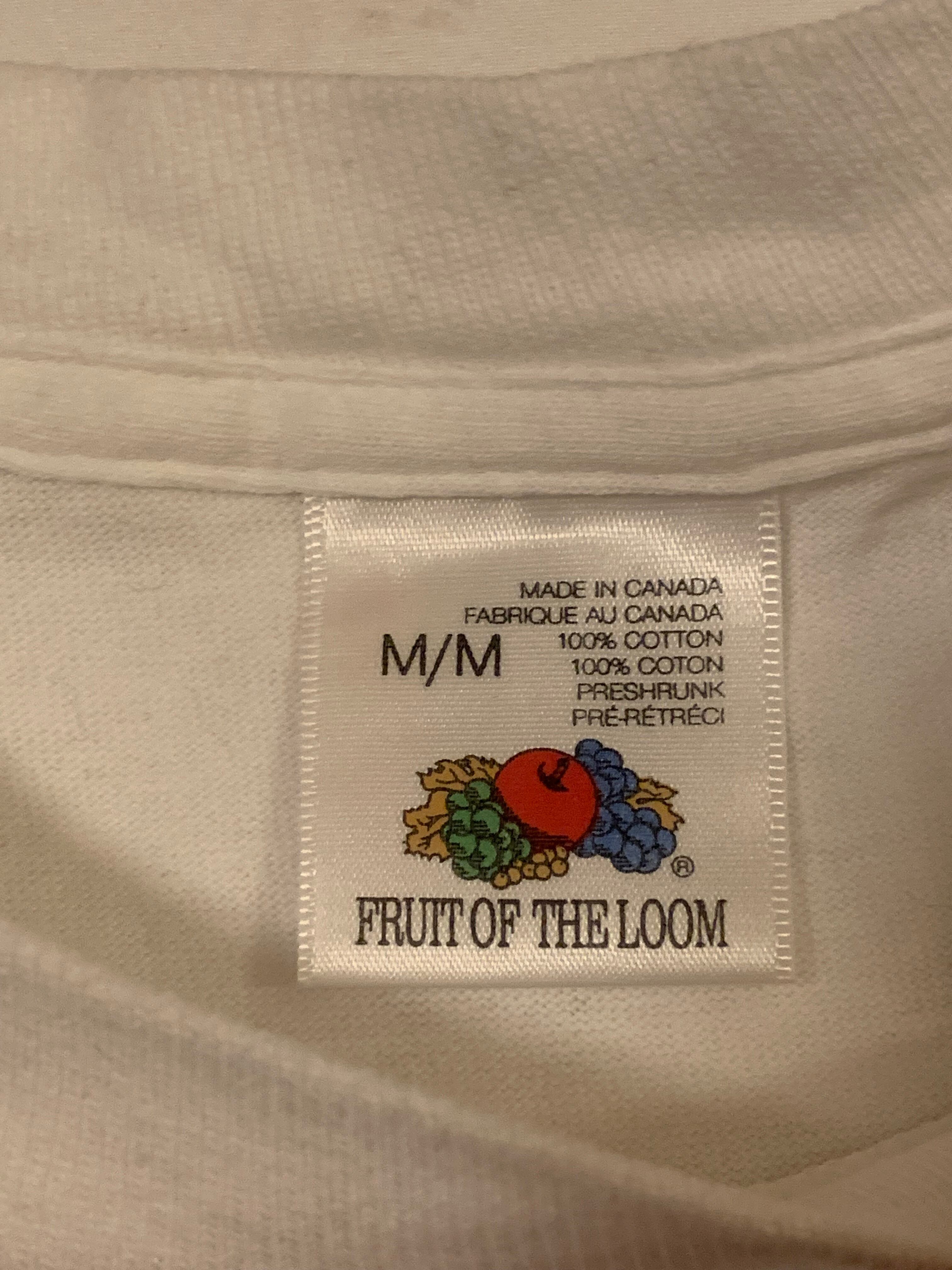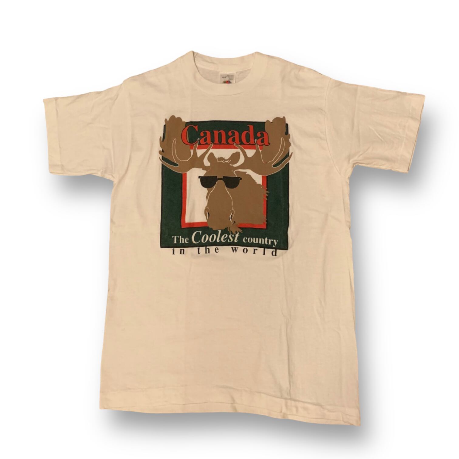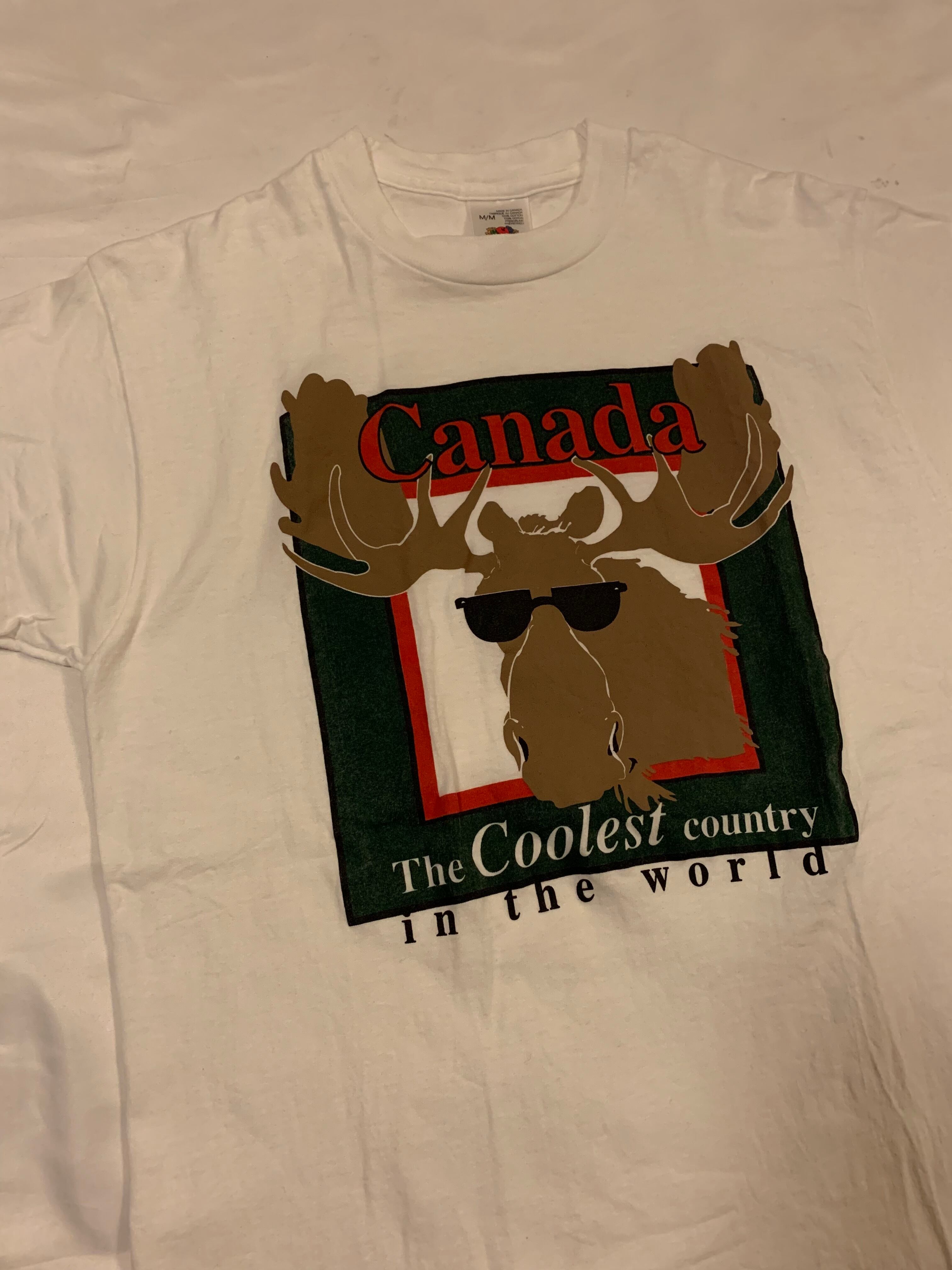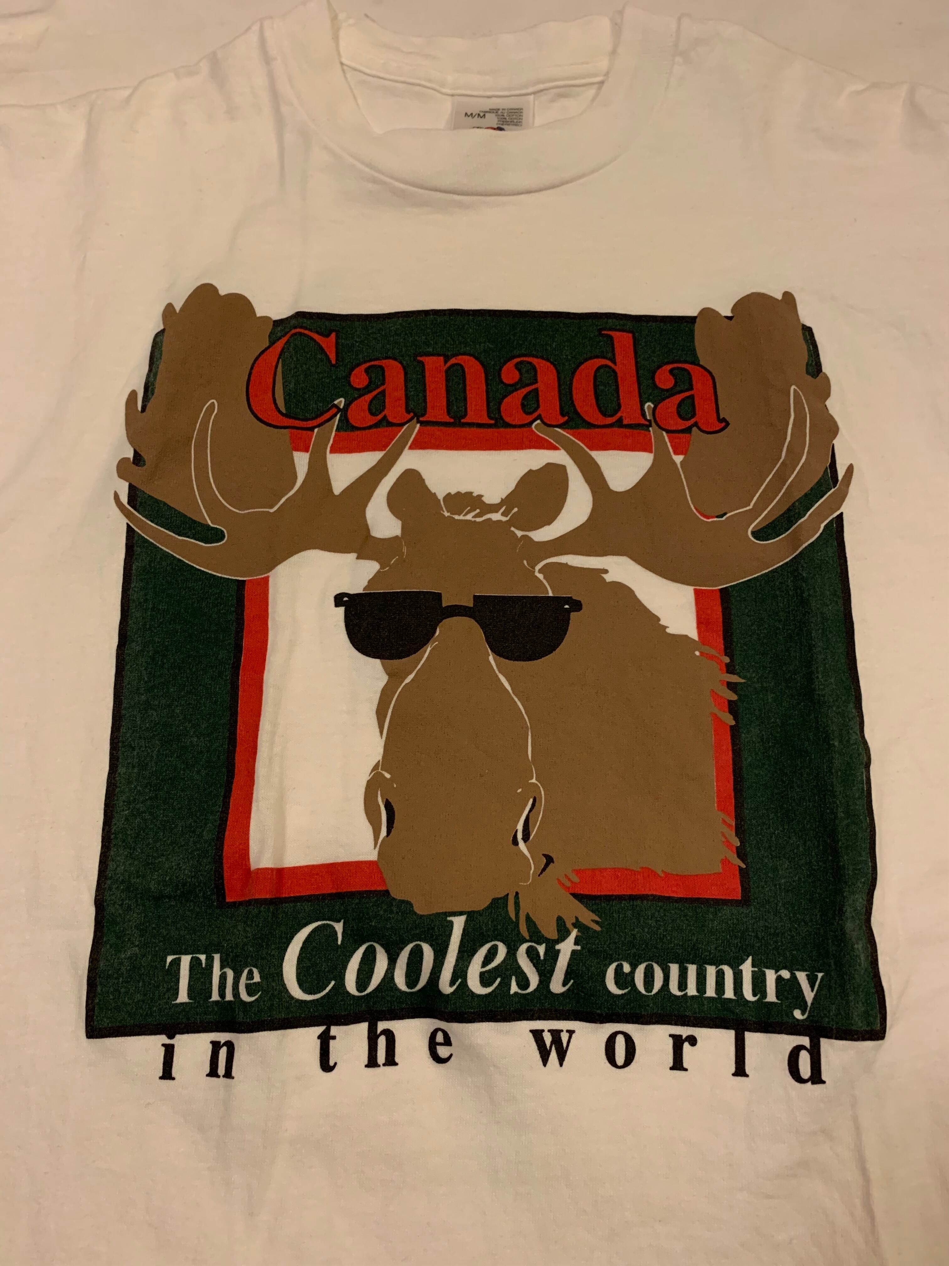 カナダ企画のフルーツオブザルームのボディに『世界で1番寒い国』という文字列とトナカイがプリントされているのにアイテムとしては半袖Tシャツというチグハグ感がたまらない一枚です。