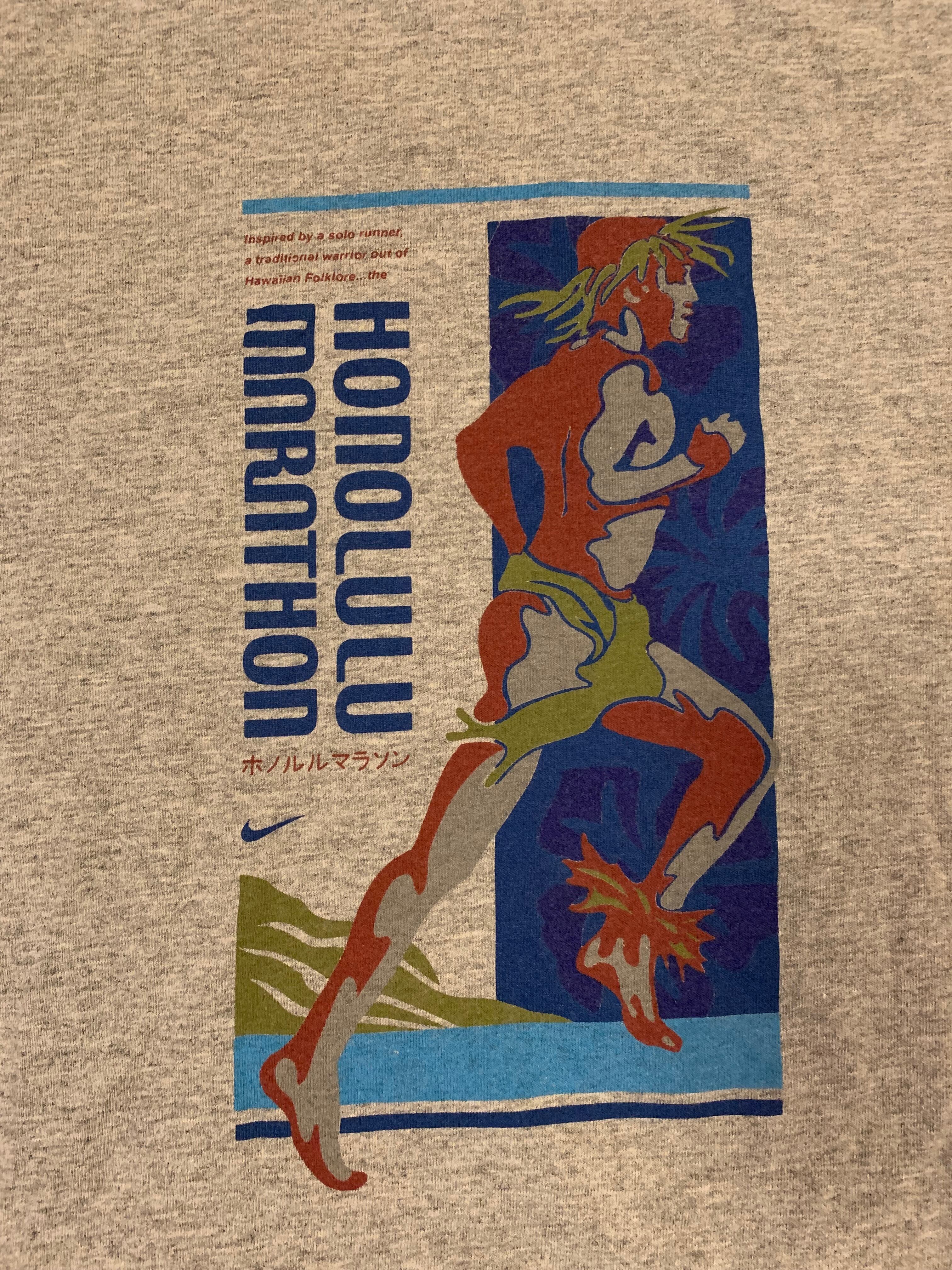 写真をご覧頂ければ分かる通り、背面のグラフィックにはカタカナでもホノルルマラソンの表記があります。