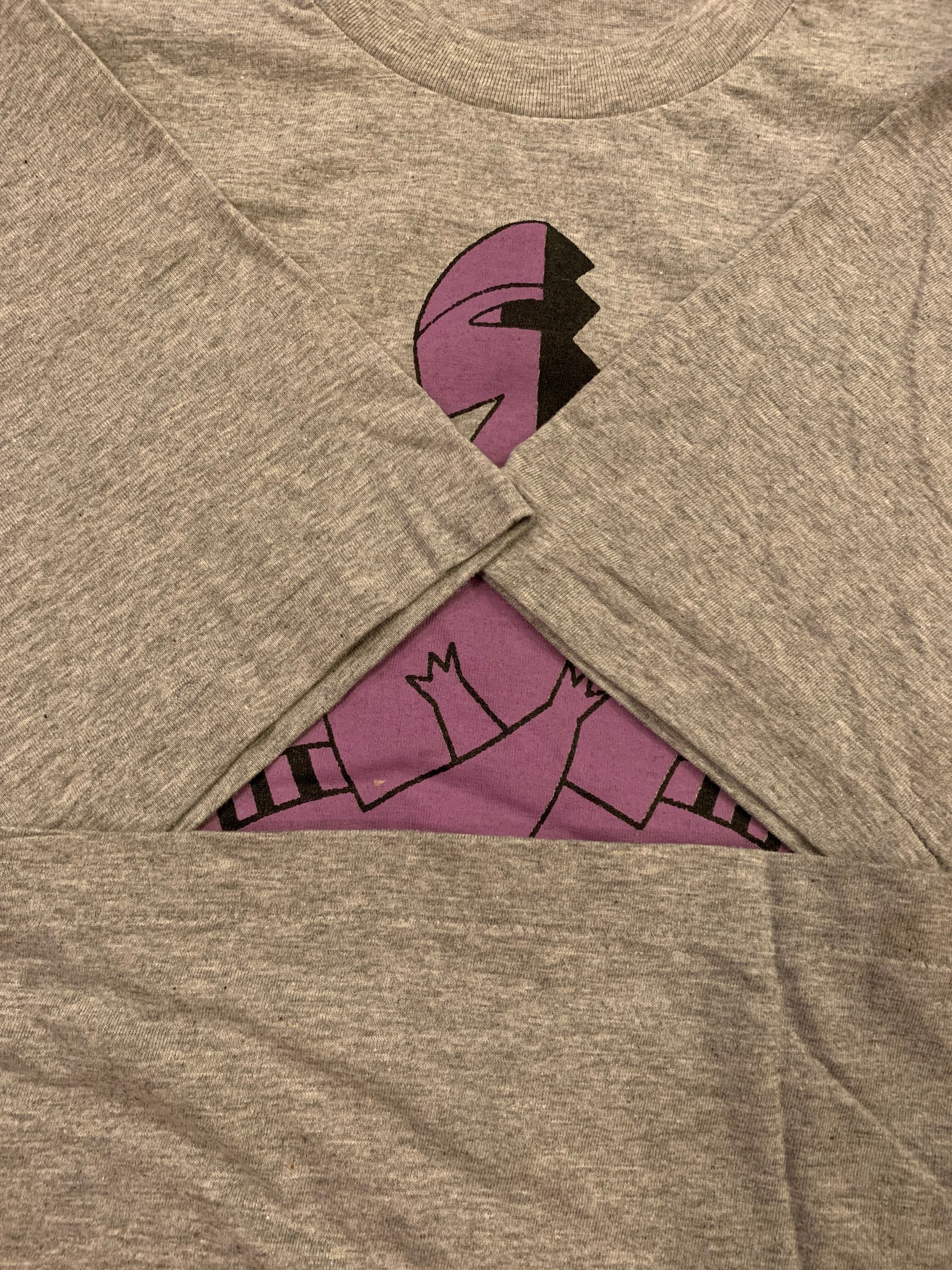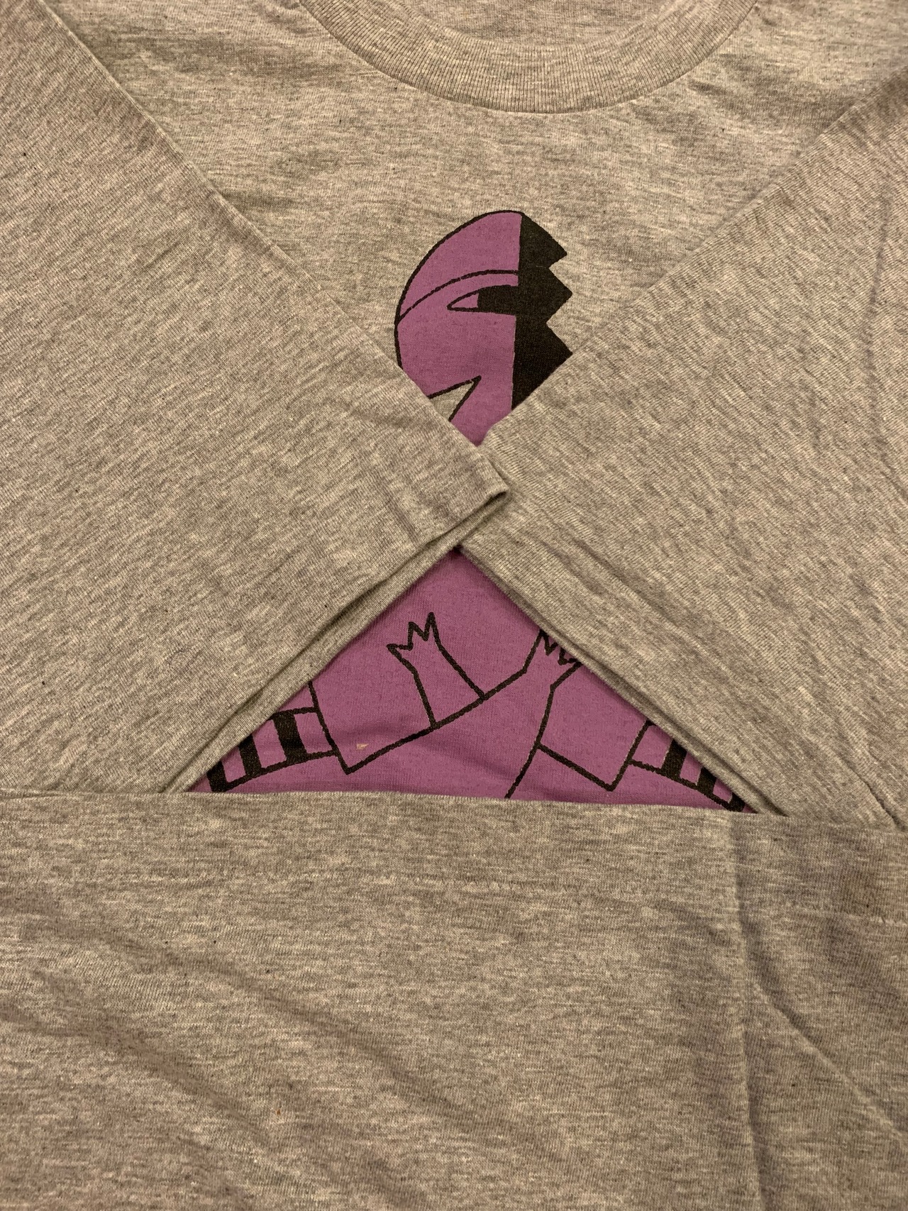 ピカソを彷彿とさせるキュビズムのようなタッチで描かれたイラストと謎の文字列がプリントされたS/SグラフィックTシャツです。