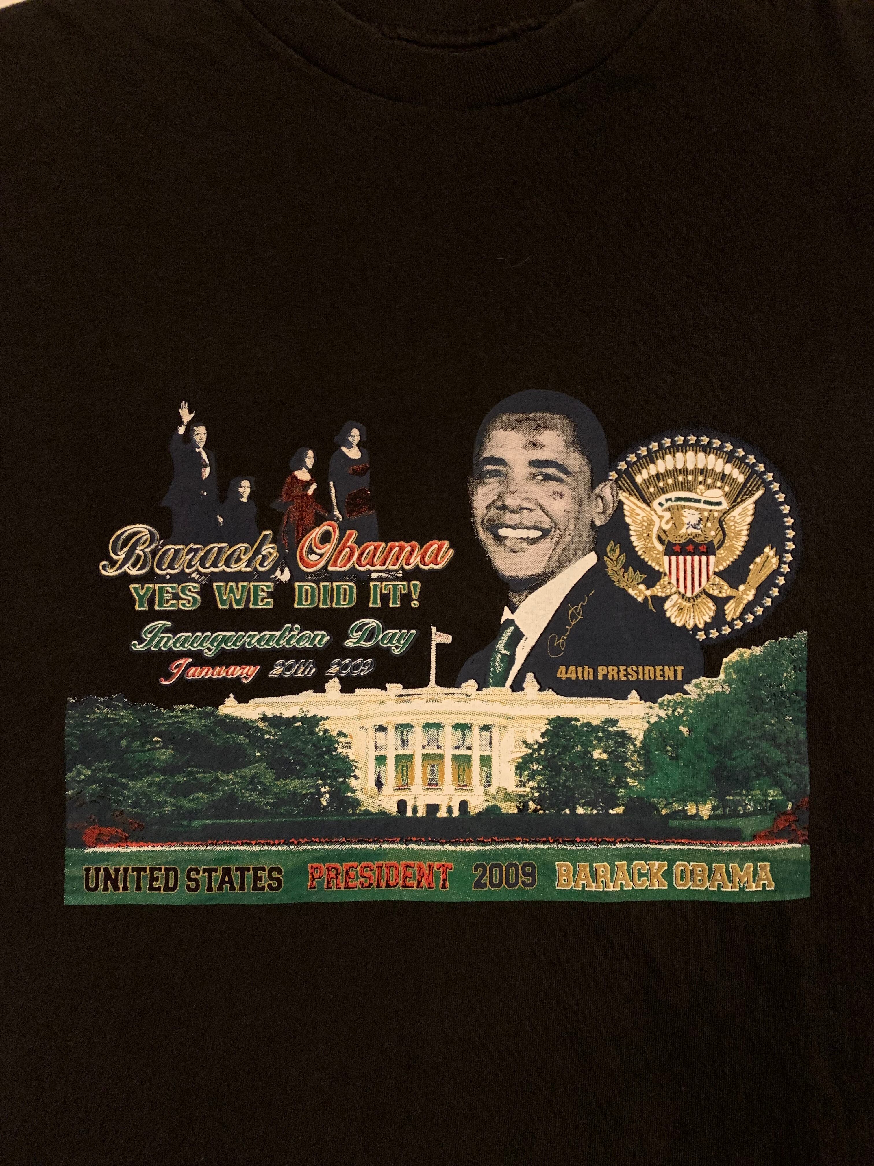 フロント部分に有色人種で初めてアメリカの大統領に就任した人物であるバラク・オバマと大統領が執務を行う官邸のホワイトハウスがプリントされたメモリアルな一枚となっています。