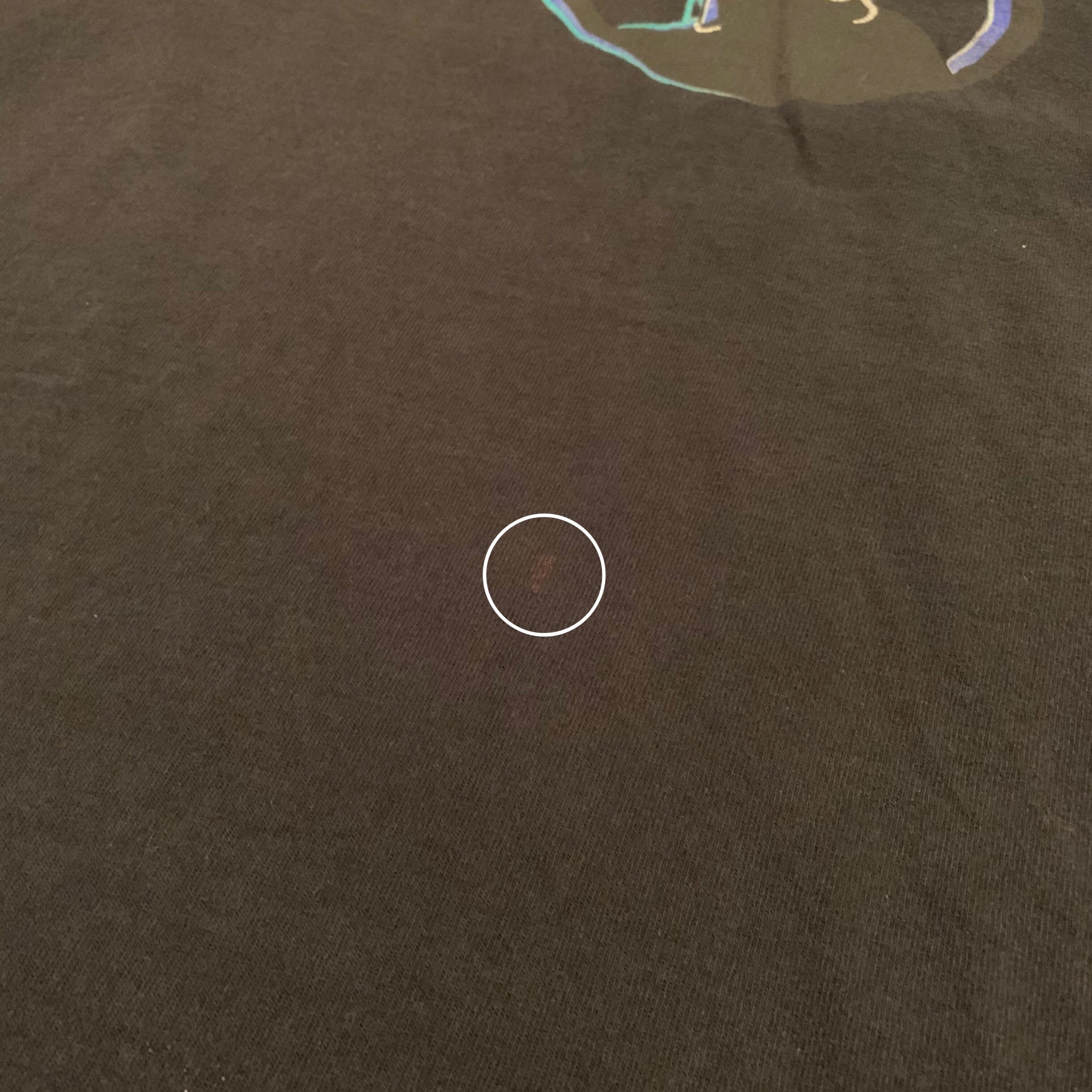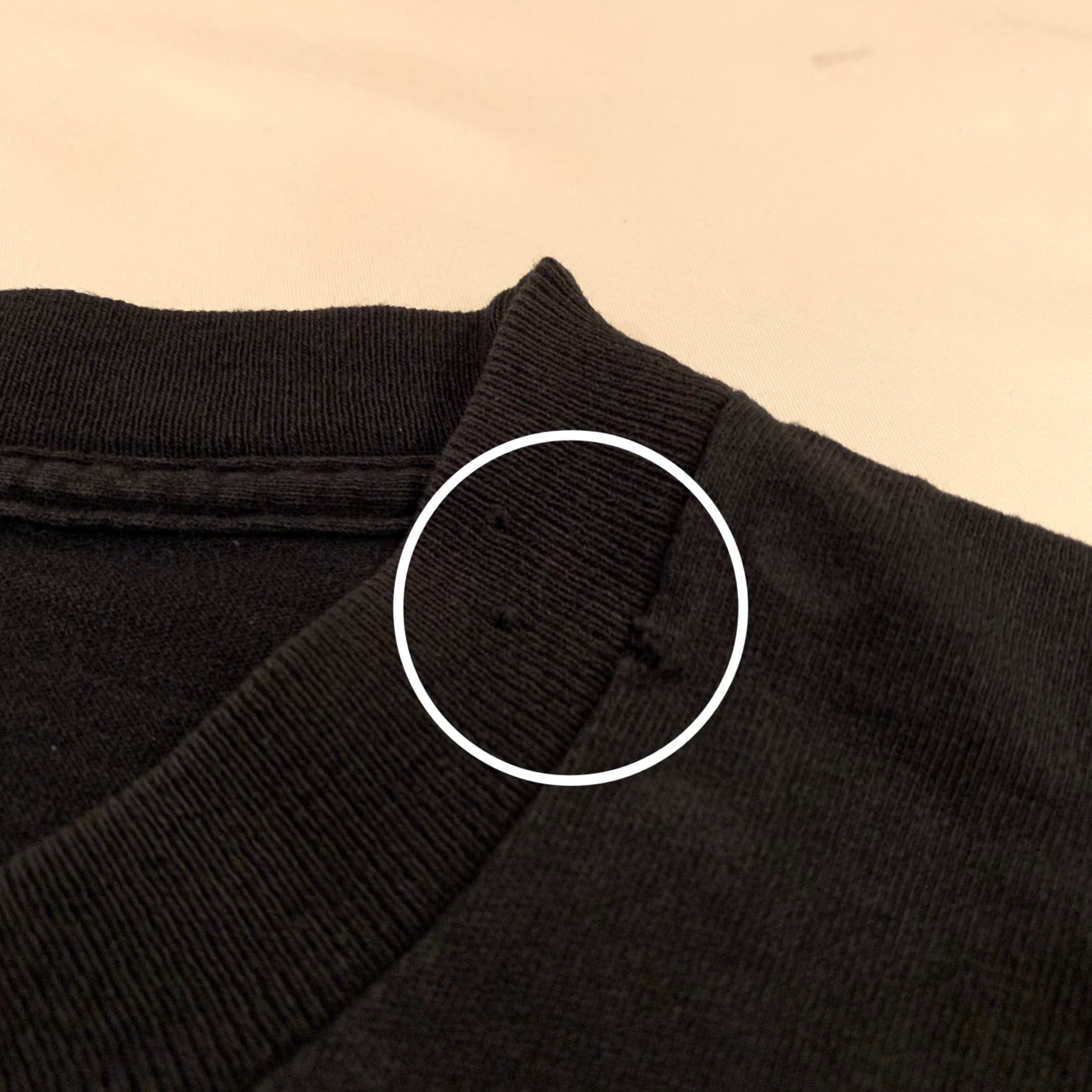 【状態】首周りに穴あり、ボディの色味に若干のフェード感あり、前身頃に1ヶ所赤い汚れあり(写真参照)