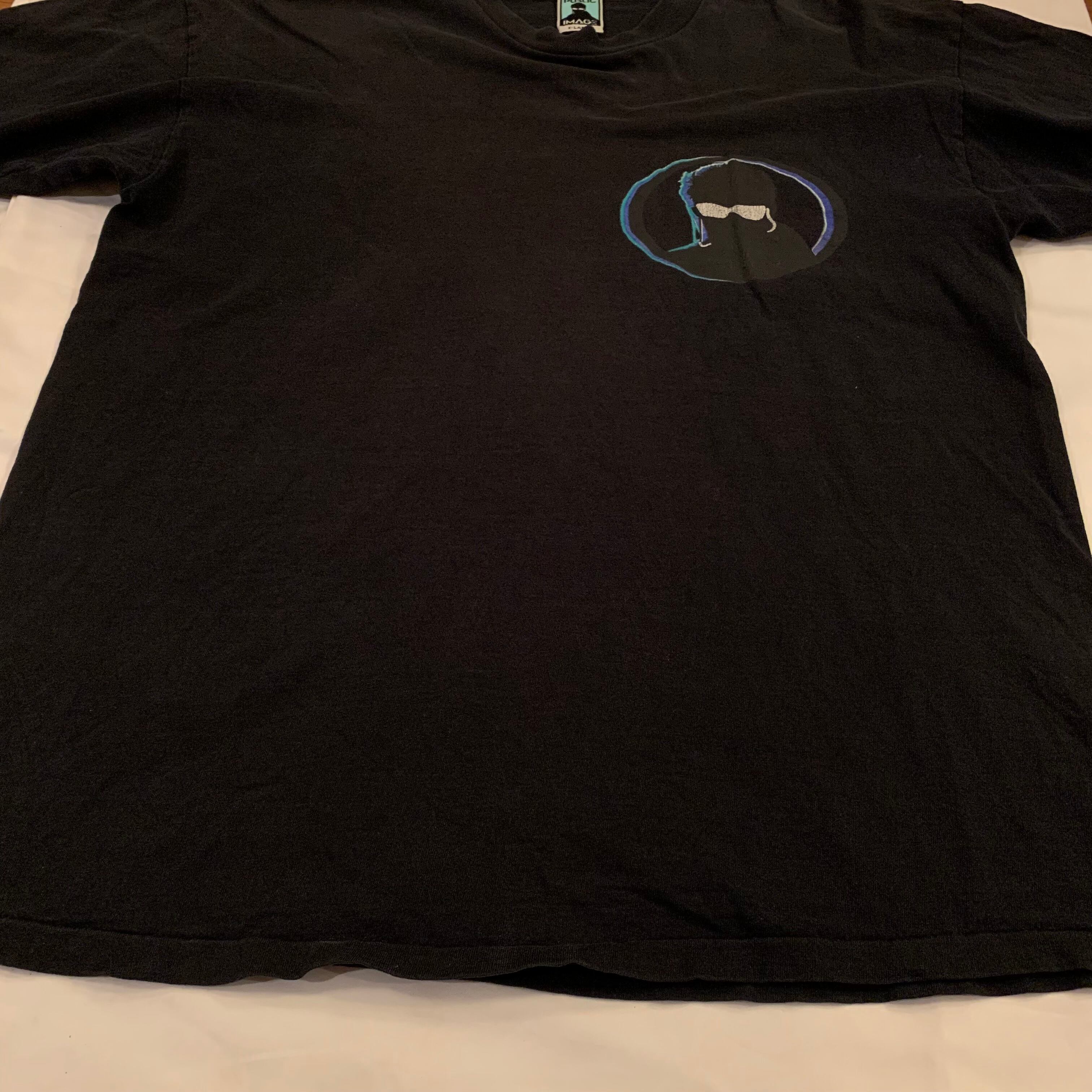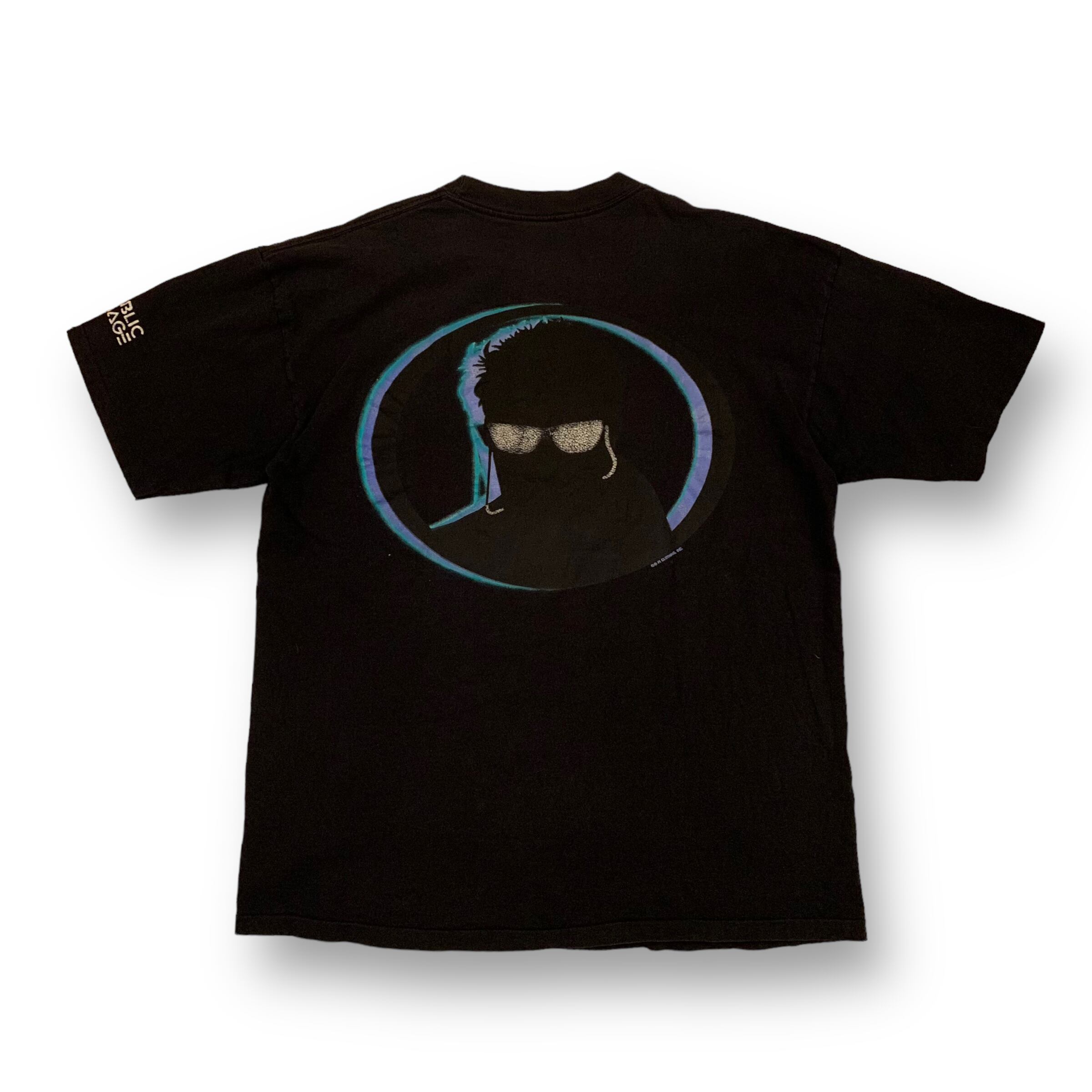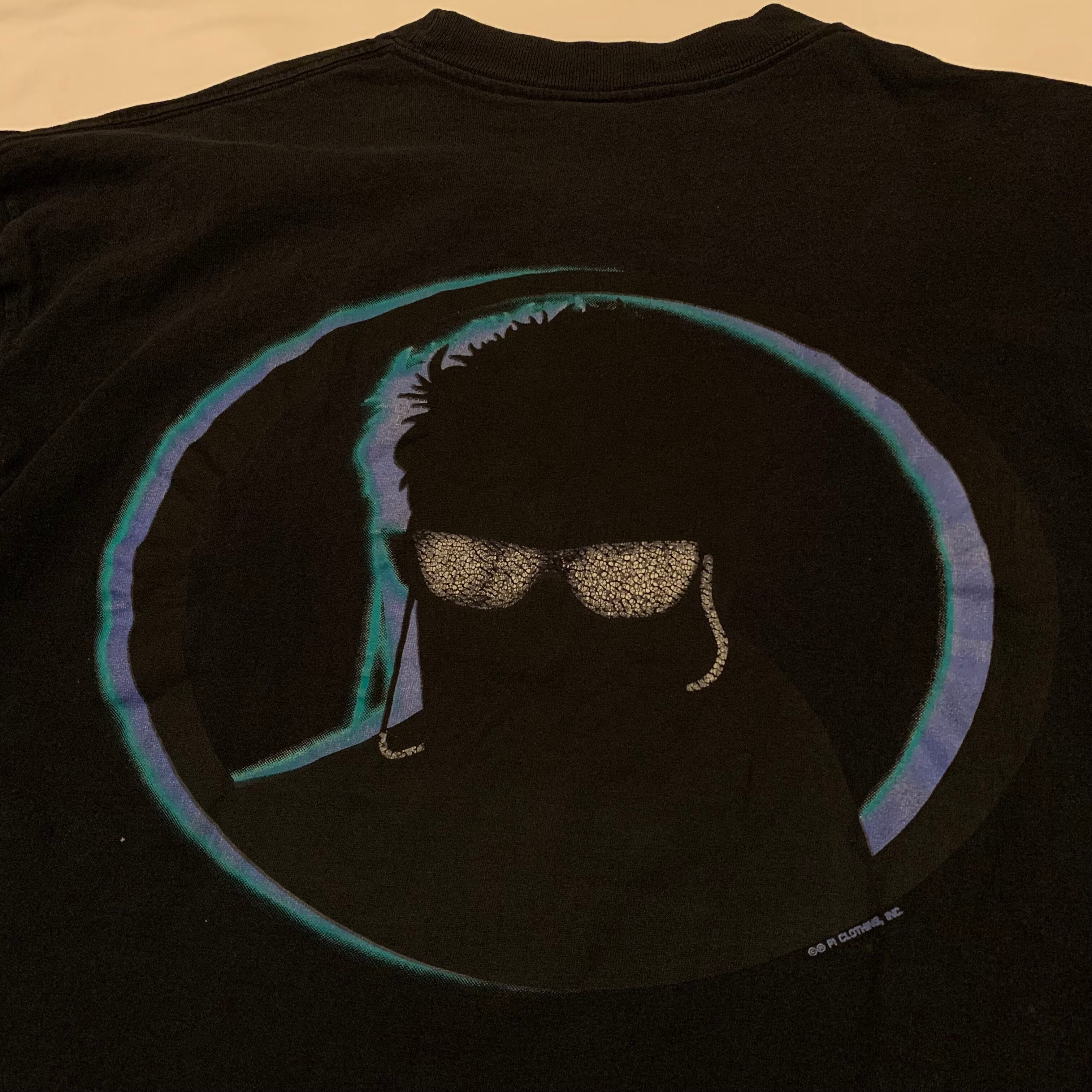 首元のブランドタグにも採用されているグラスコードが繋がれたサングラスを掛けた男性のシルエットが両面にプリントされた何処か近未来感のあるグラフィックが目を引くこちらの一枚。