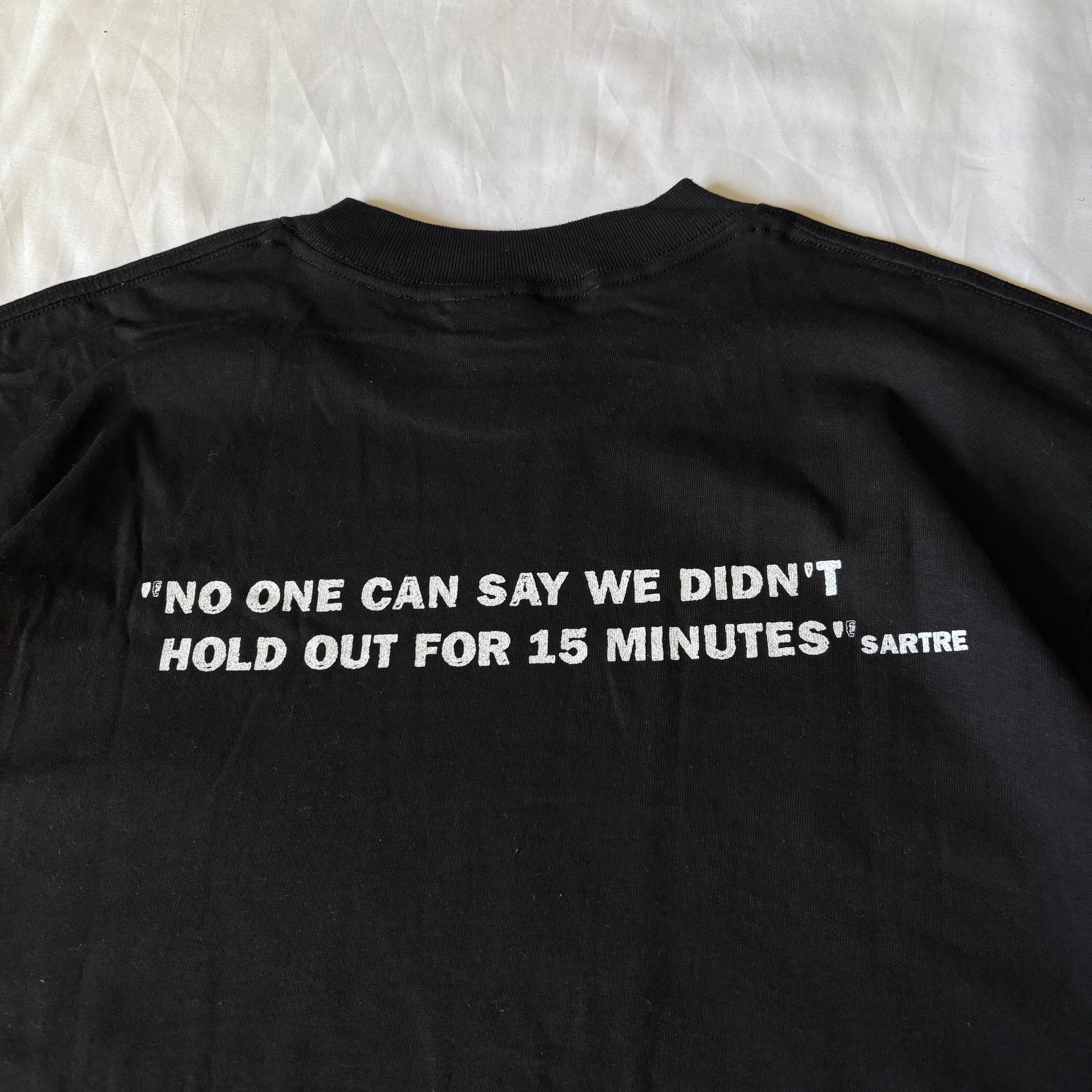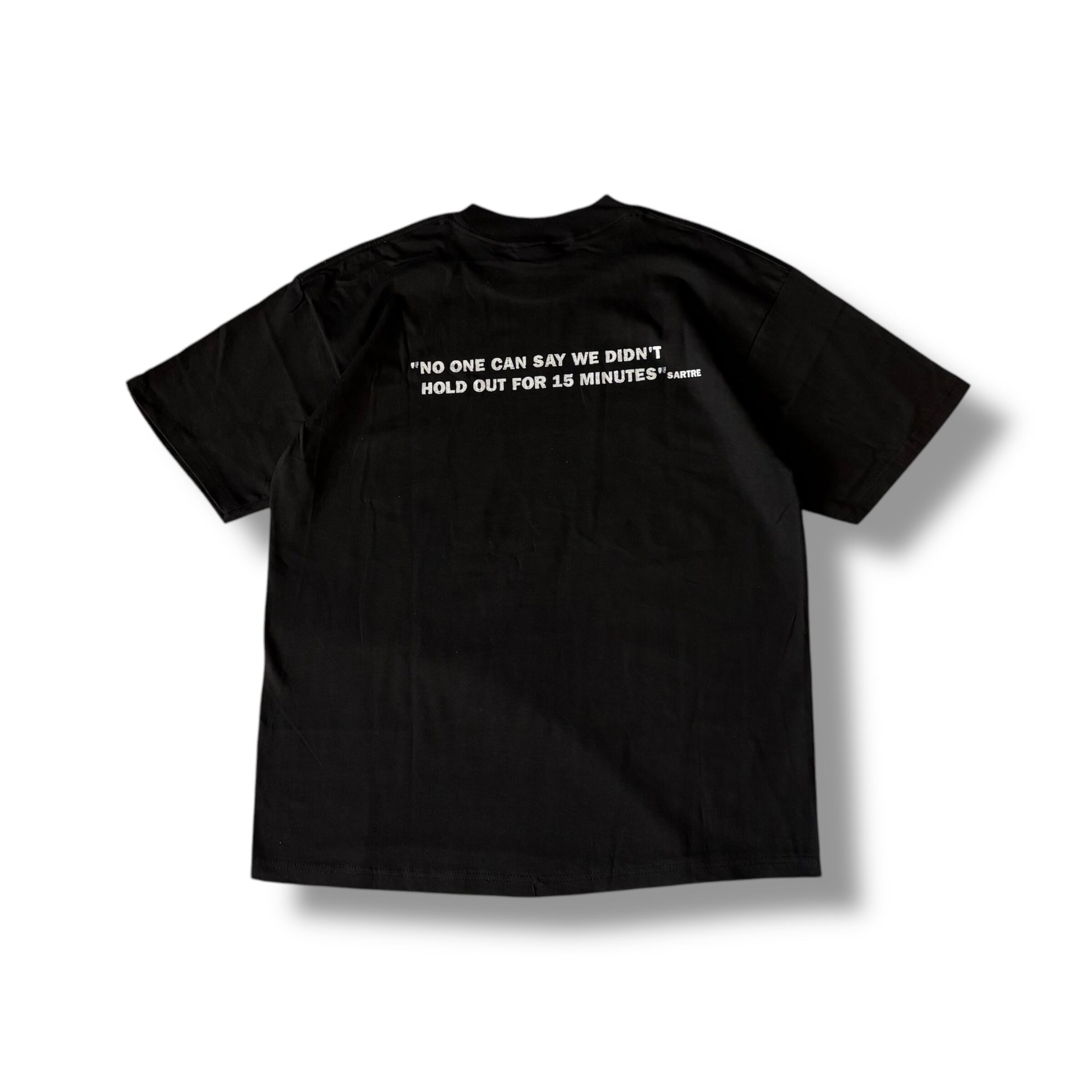 前面にはバンドとアルバムの名称とメンバーが無機質なカラーリングで落とし込まれたブラックのボディカラーに映えるグラフィックが、背面にはフランスの哲学者であるジャン=ポール・サルトルの名言が引用された両面プリント仕様になります。